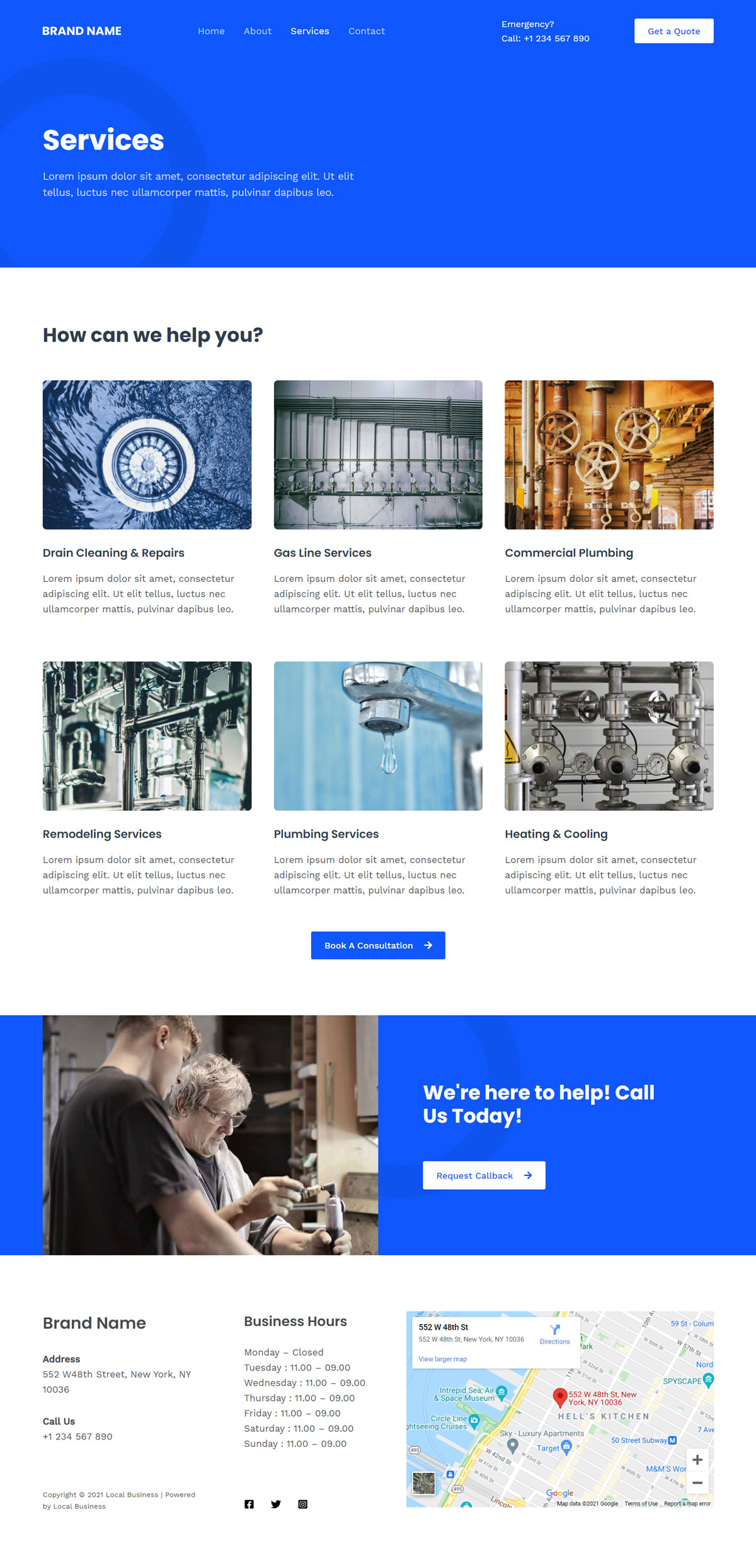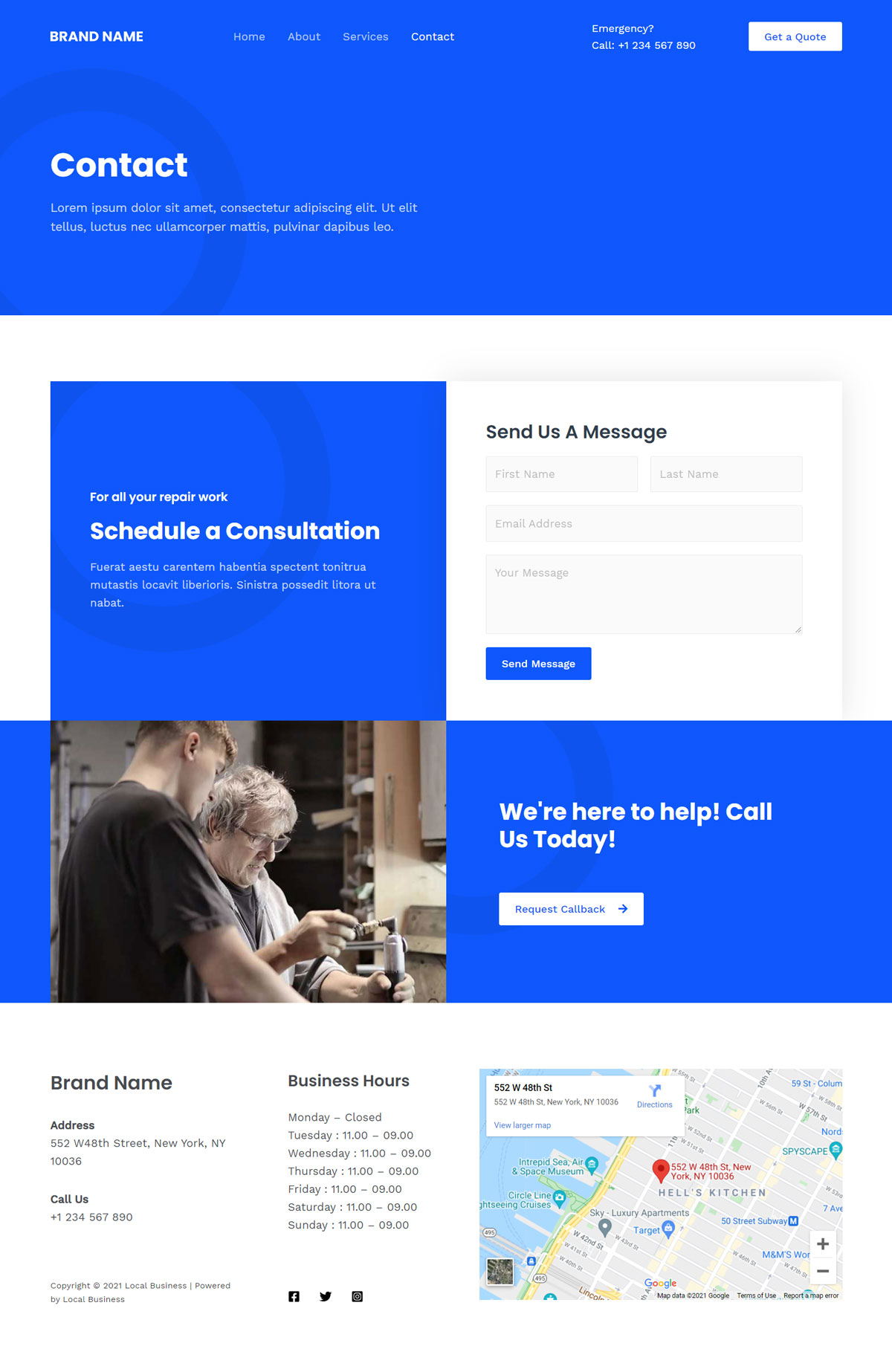 本地业务模板的主要功能专业设计的模板,专为推广您的本地服务而定制列出所有服务并包括路德您已完成的工作组合还包括客户评价以增强可信度显示办公时间并集成谷歌地图以帮助客户定位您全球调色板允许您自定义并使用网站颜色