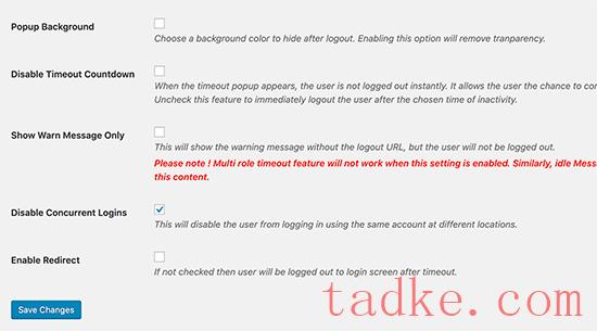 The ‘禁用超时计数’选项将删除倒计时警告,并将直接注销闲置用户。