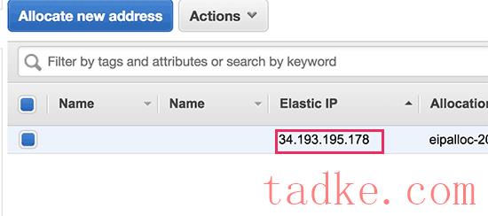 AWS现在将为您的WordPress EC2实例创建一个新的弹性IP。您将看到您的IP地址列在一个表中。只需选择IP地址行,然后选择‘Actions’按钮下的‘Associate Address’。