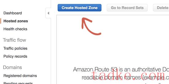 这将把您带到托管区域部分。继续并点击“创建托管区域”按钮。