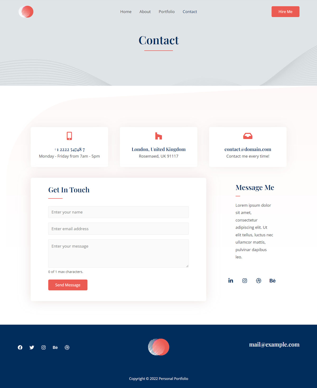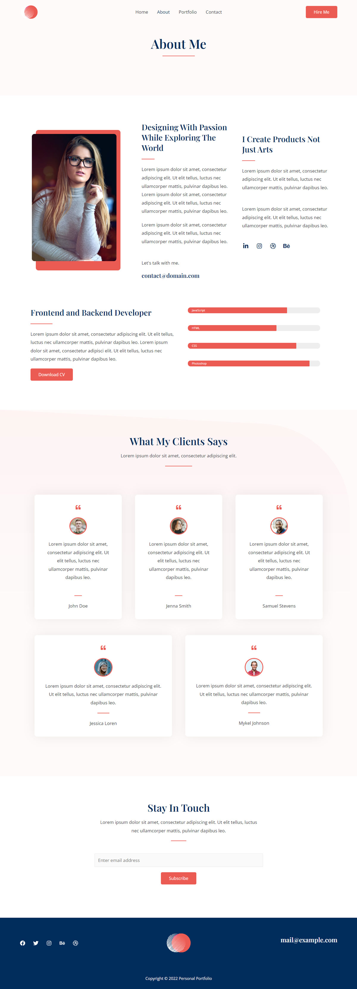 个人投资组合模板的主要功能简单而有吸引力的投资组合web模板标题图像和标题建立即时联系彩色和衬线字体有助于激发信心多种选项来宣传您自己和您的工作现成的投资组合和联系页面与流行的拖放页面生成器完全兼容