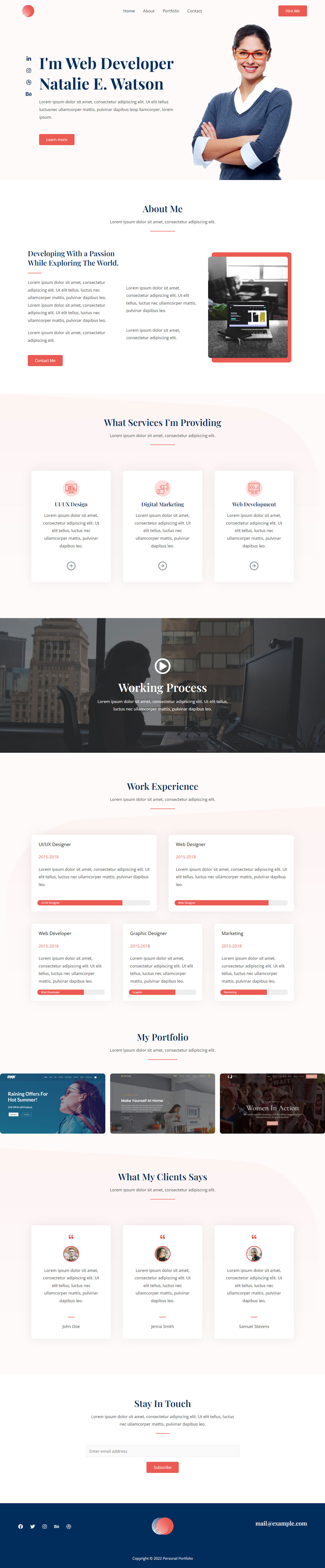 个人投资组合模板旨在展示您和您的服务,但不会超出范围。主页图像设置场景,衬线字体和平静颜色的使用激发信心。