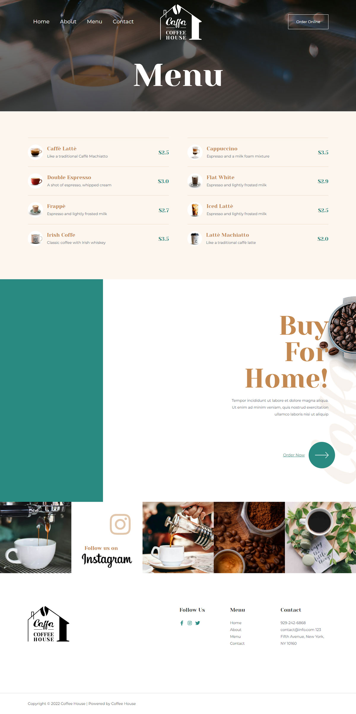 咖啡屋模板的主要特点正是您期望从咖啡屋获得的感觉温暖、热情的颜色和字体吸引人的菜单部分和页面可以与WooCommerce集成以销售产品主页中内置的Instagram部分与领先的拖放页面生成器兼容