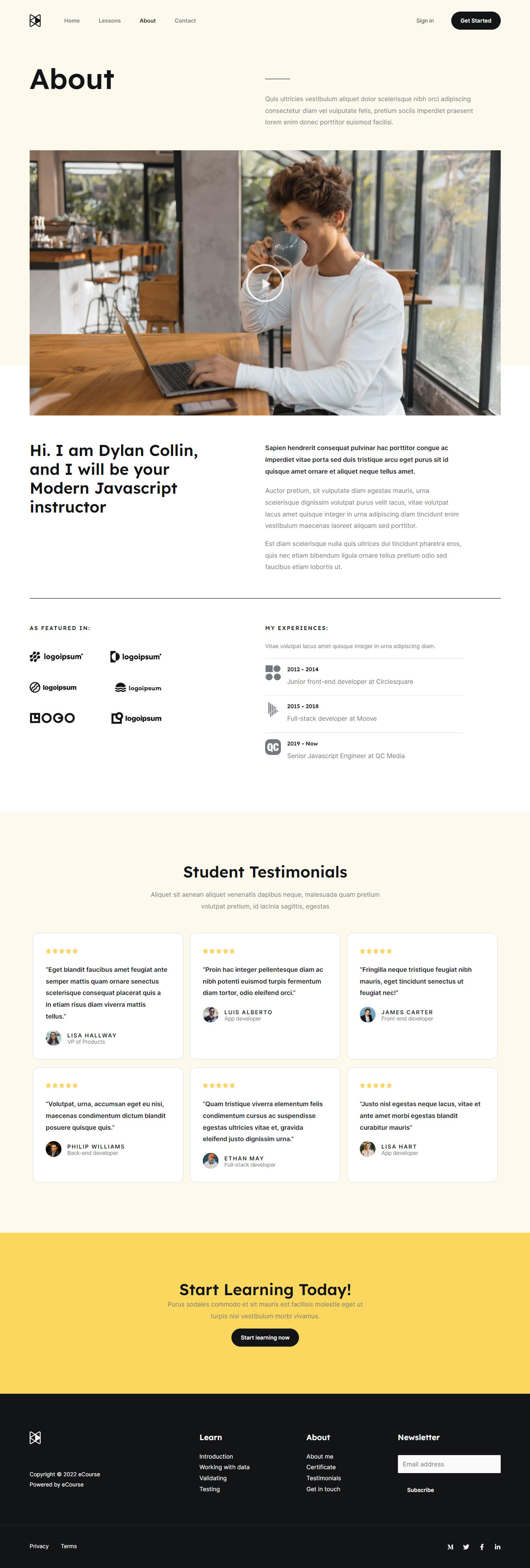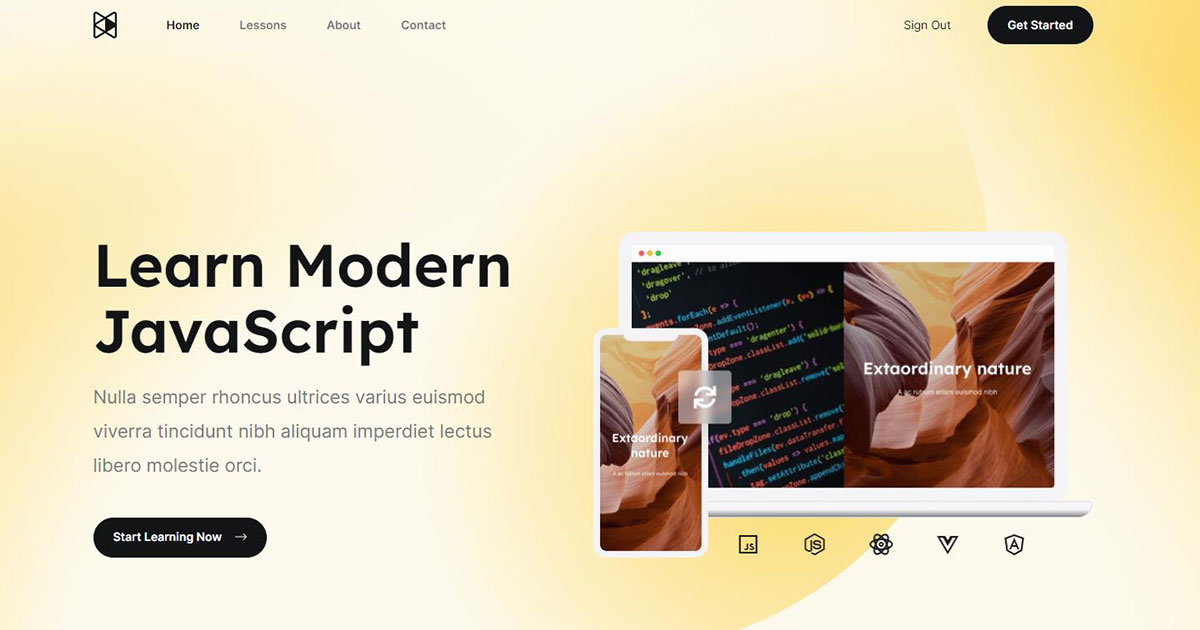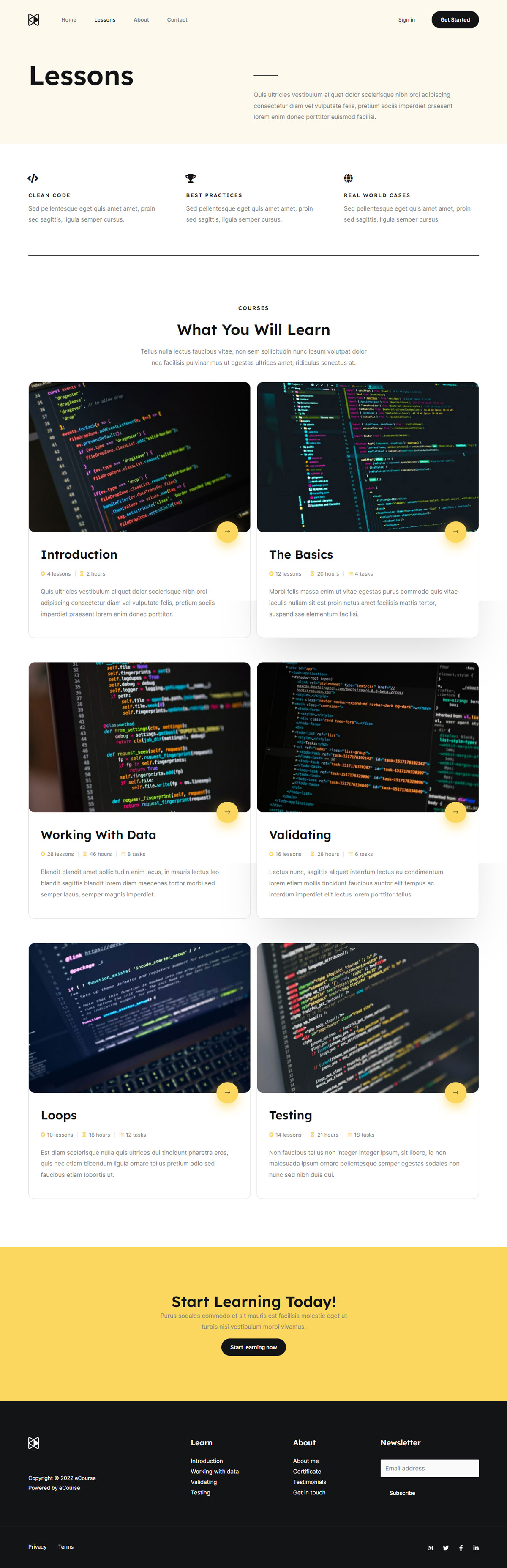 电子课程模板提供了一个明亮、温馨的替代方案。虽然是为编码人员设计的,但你可以很容易地看到如何定制它以适应任何类型的电子学习网站。