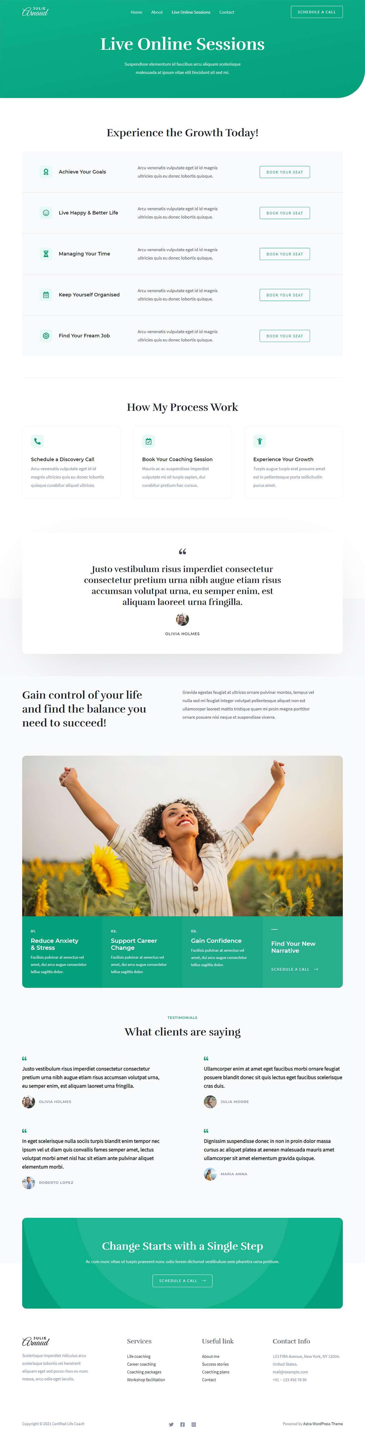 生活蔻驰模板的主要特点专业设计的模板,非常适合生活教练和培训师宣传教练的重要英雄形象包括主页上提供的各种服务和套餐专门展示客户评价以建立信任与领先的页面构建者完全兼容
