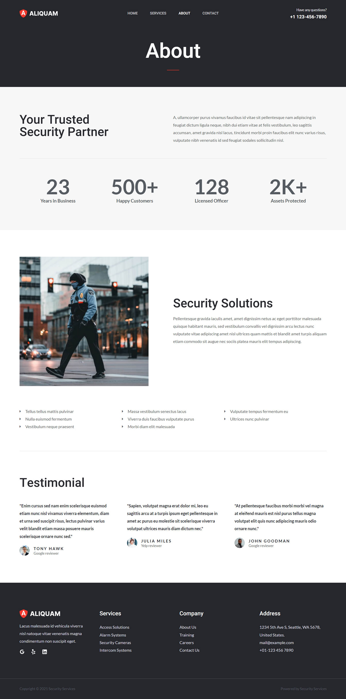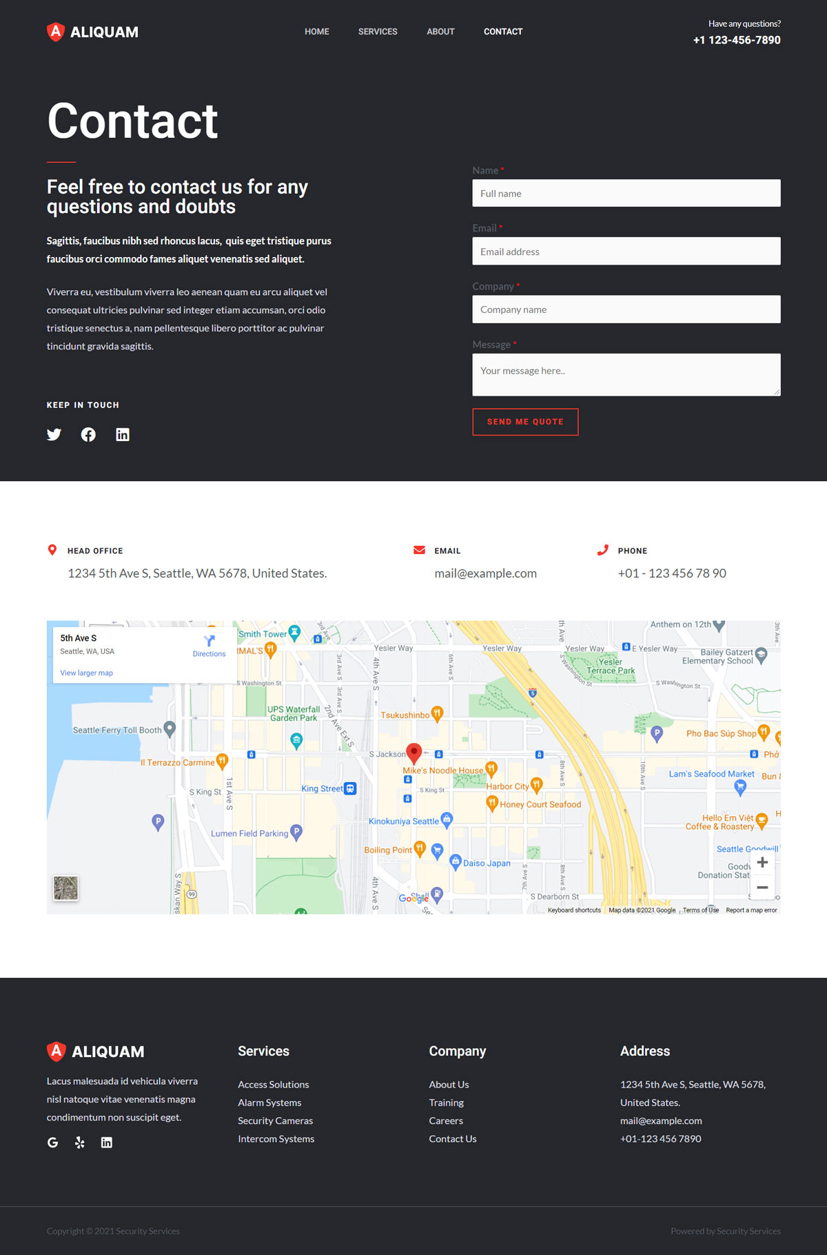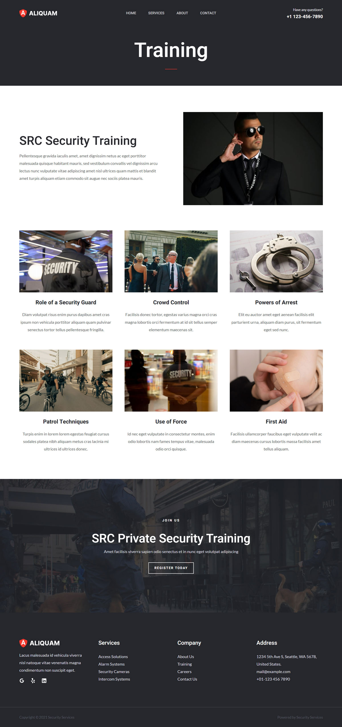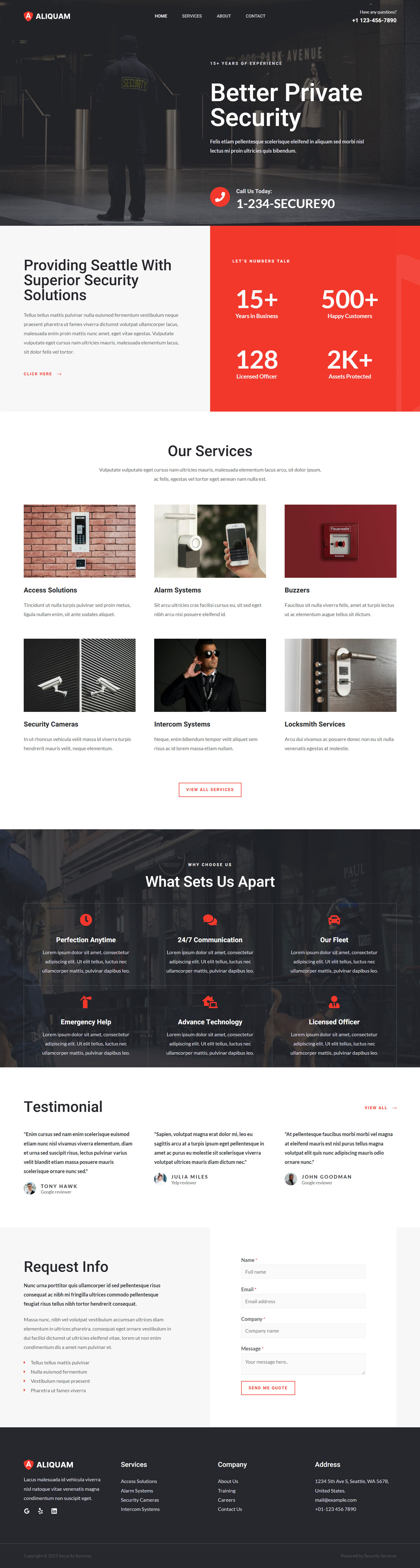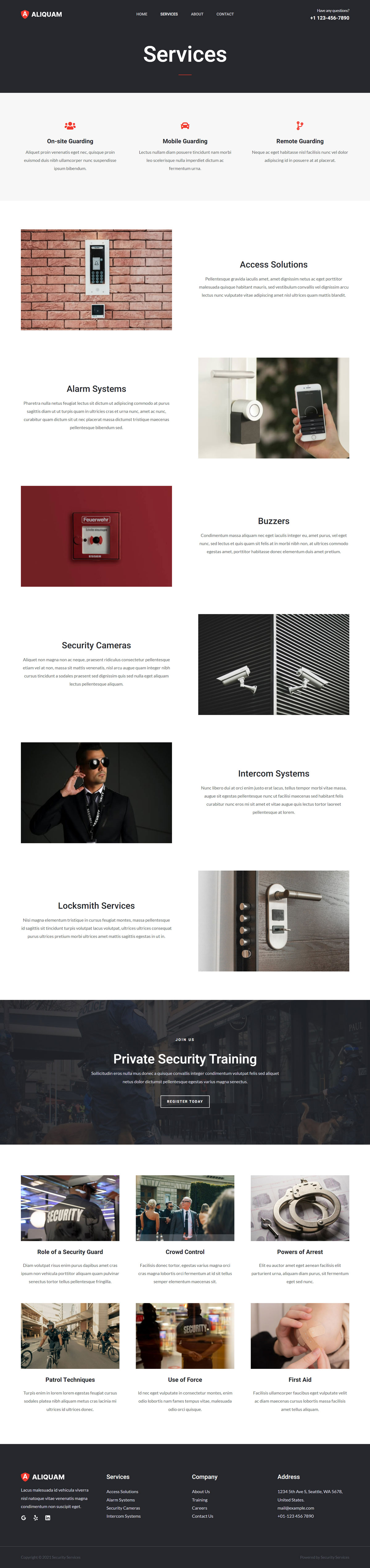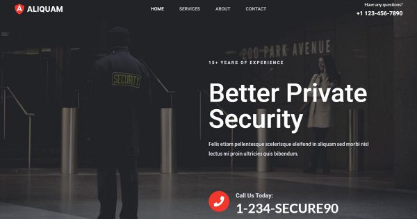 security Services是一个令人印象深刻的设计,旨在描绘该主题的严肃性,而又不显得咄咄逼人。深色的主页图像由白色字体和亮红色形成对比,有助于保持你的脚踏实地。