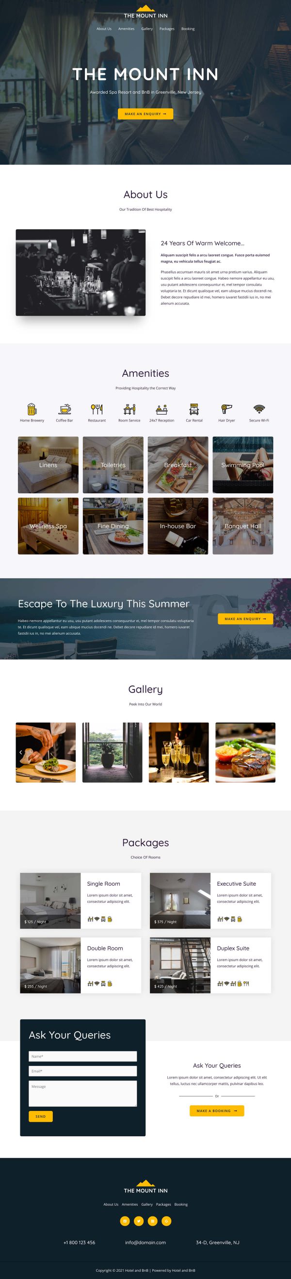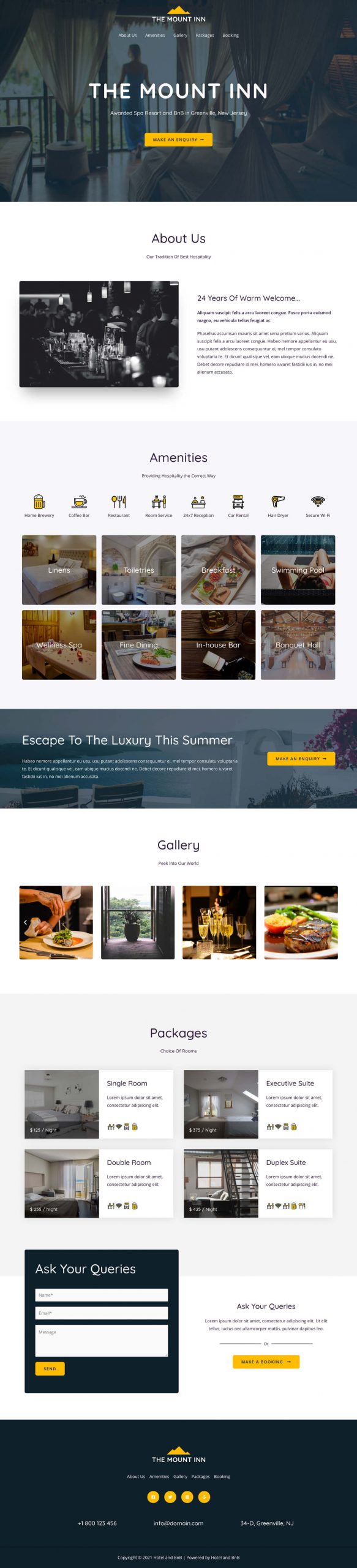 该设计是现代的,具有很好的平衡性,以及介绍您的酒店和吸引客人所需的所有页面功能。还有一个清晰的行动号召,一个画廊页面,预订表格选项,以及在你的网站上添加任何你喜欢的东西的机会。