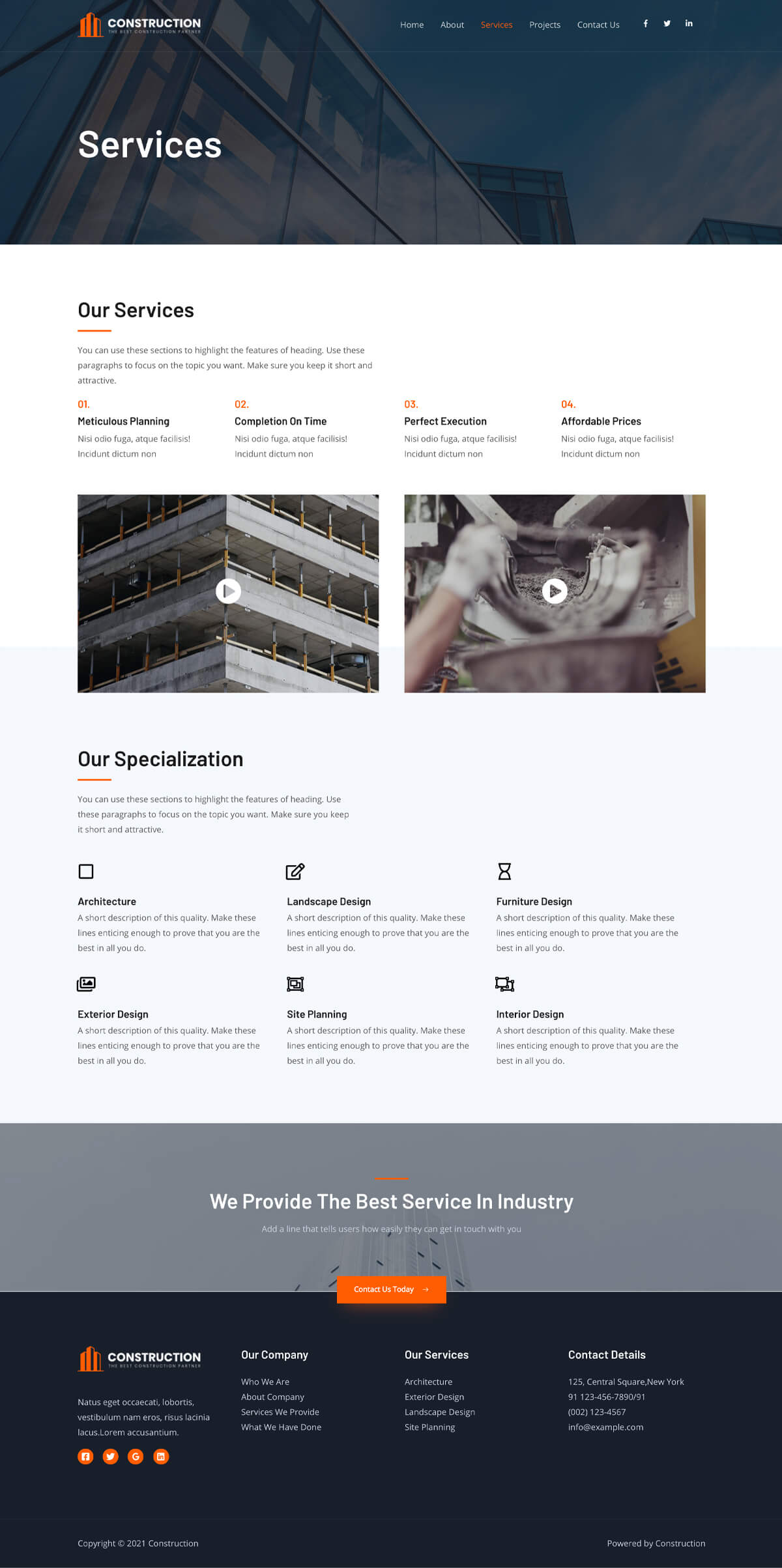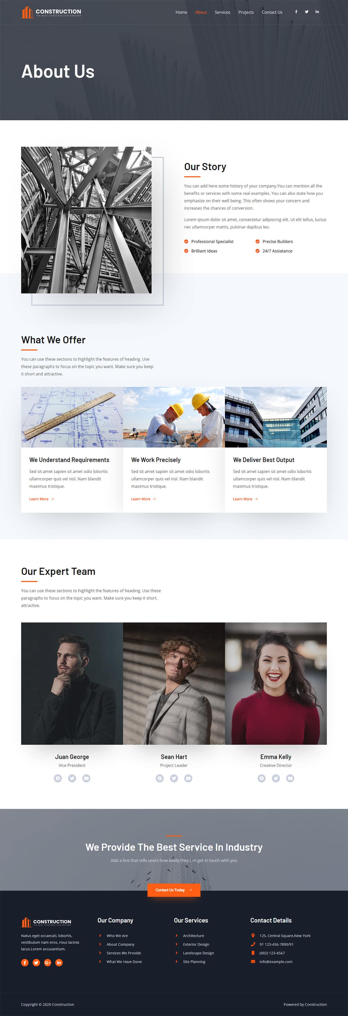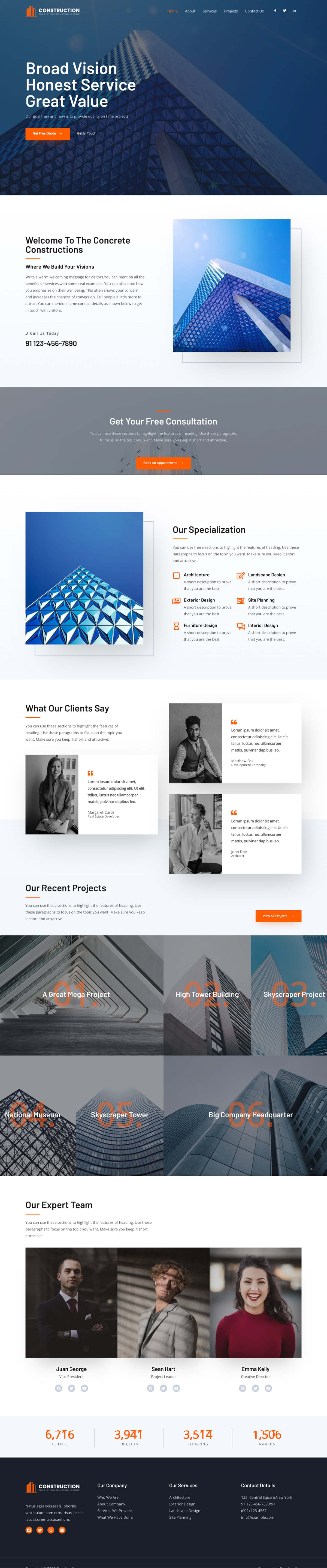 实时预览建筑模板非常简洁明快,非常适合有远见的企业。在为建筑而设置时,您可以轻松地将它用于建筑、房地产和其他业务类型。