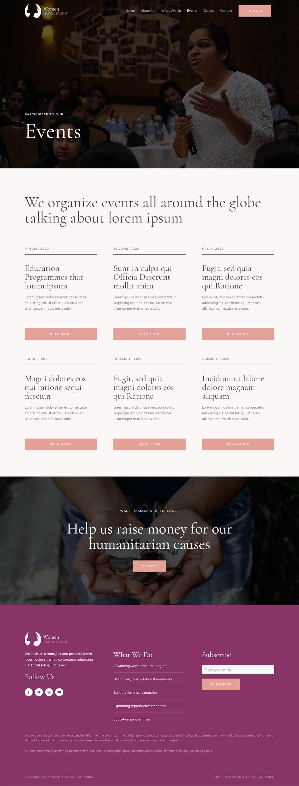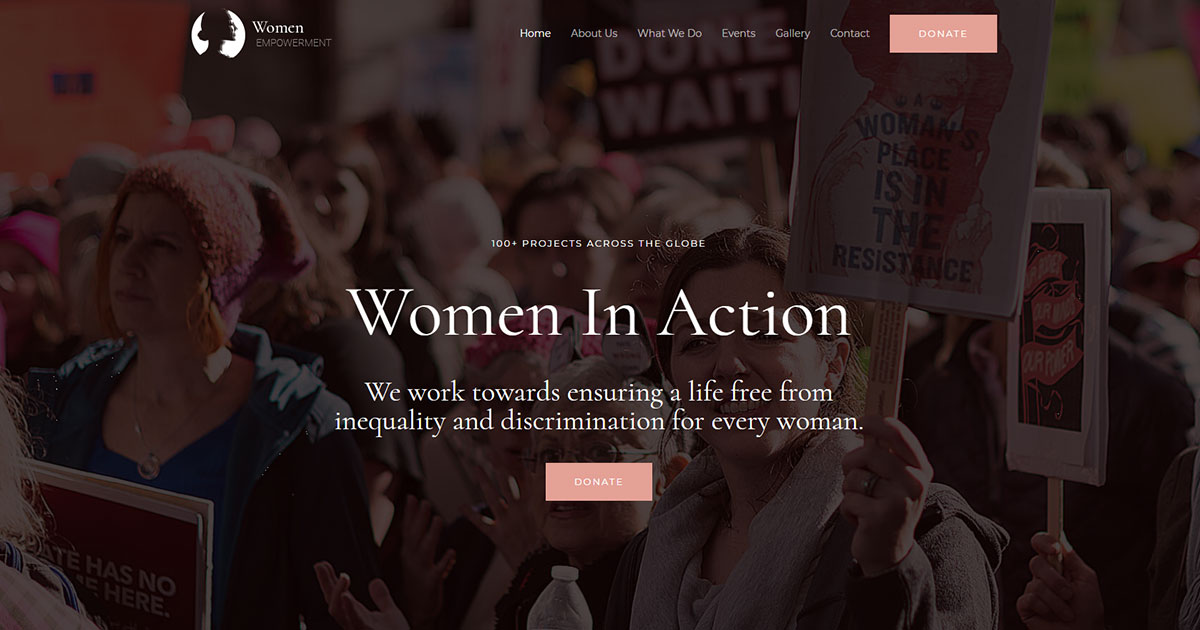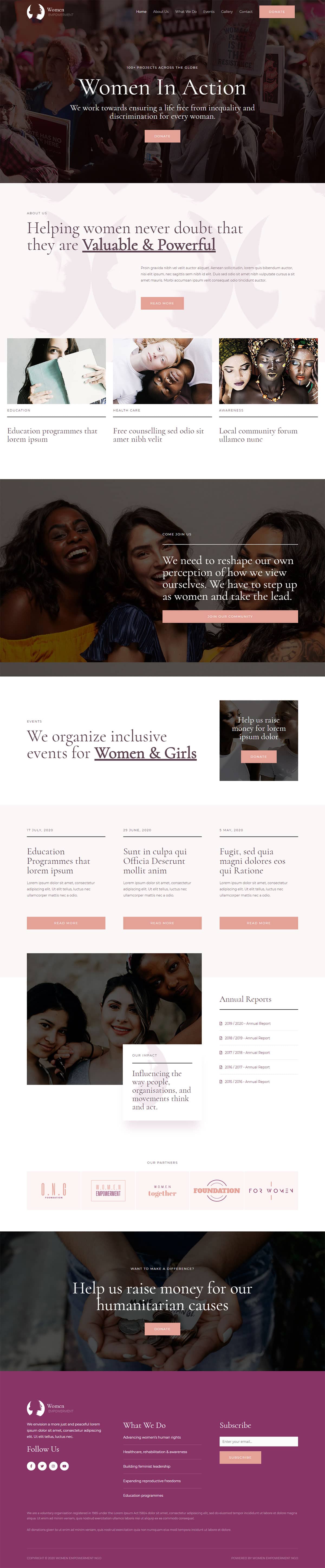 增强妇女权能非政府组织模板一加载就给人一种愉快的感觉。在进入明暗交替的主页之前,它以一个带有柔和色彩和适度标题的全屏图像标题打开。
