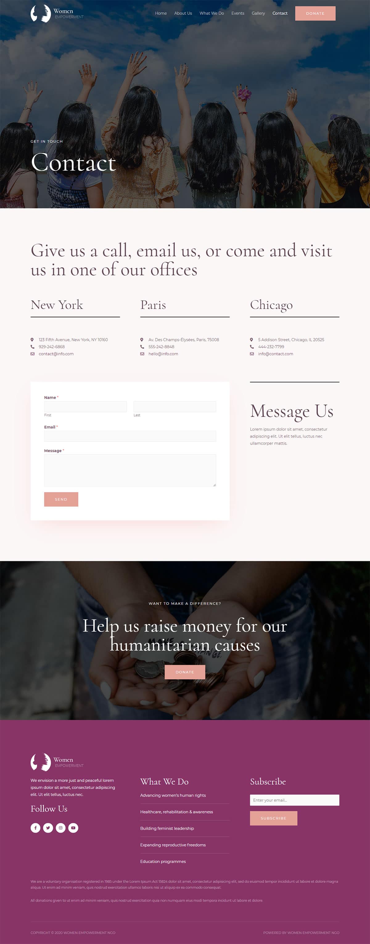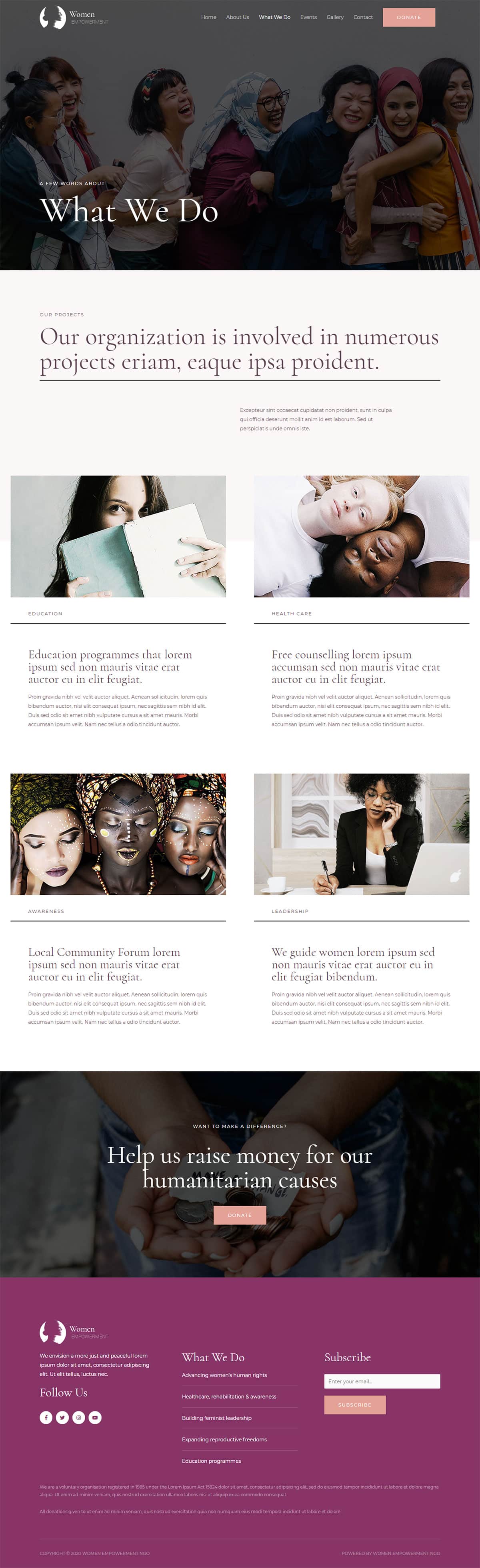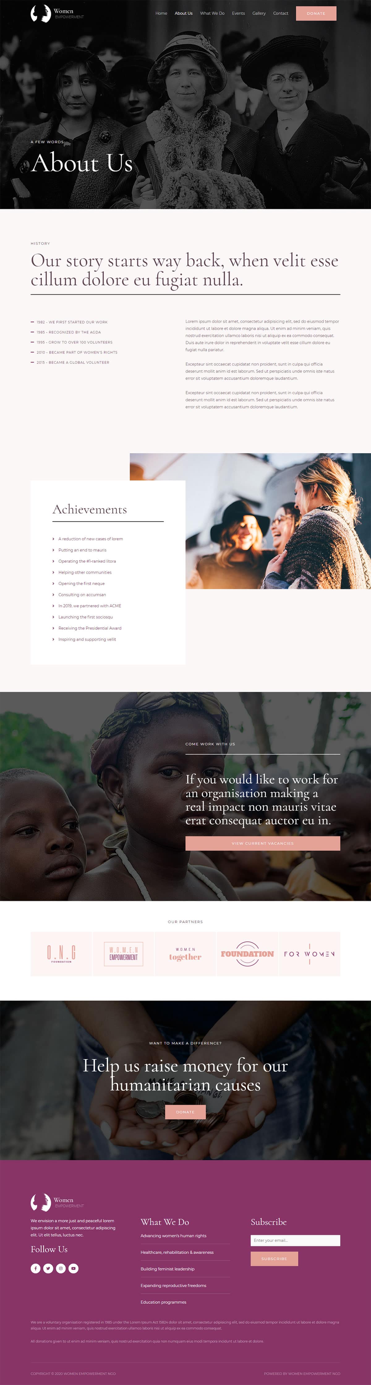妇女赋权非政府组织模板的主要功能令人愉快的、受欢迎的非盈利网站模板软件颜色和字体让您感觉自己是受欢迎的使用视差效果交替明暗区域行动和号召元素与领先的页面生成器完全兼容