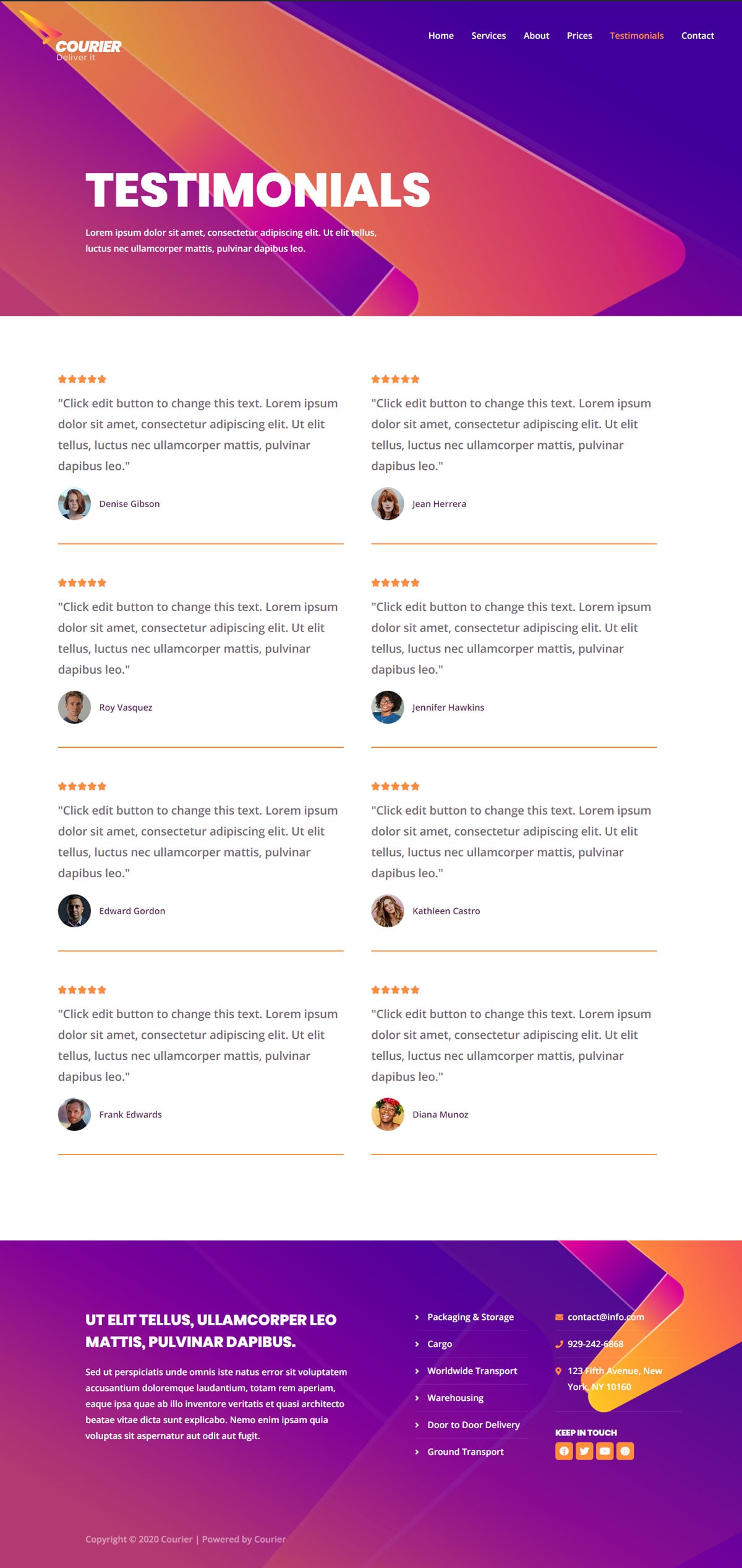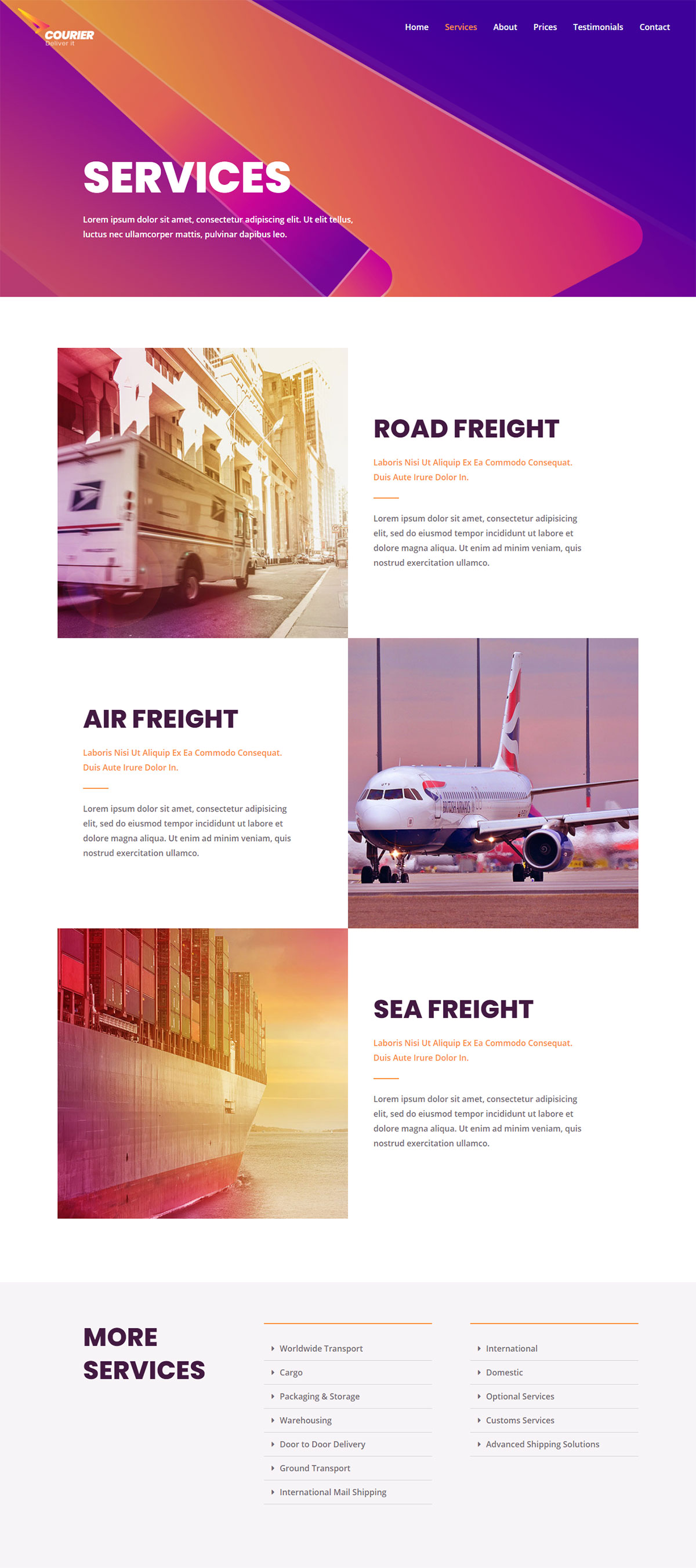 《信使报》的主要特点。递送服务模板明亮多彩的web模板是快递公司和递送服务的理想选择一加载就受到欢迎预订表单前端和中心每页上的可定制内容部分与领先的页面生成器完全兼容