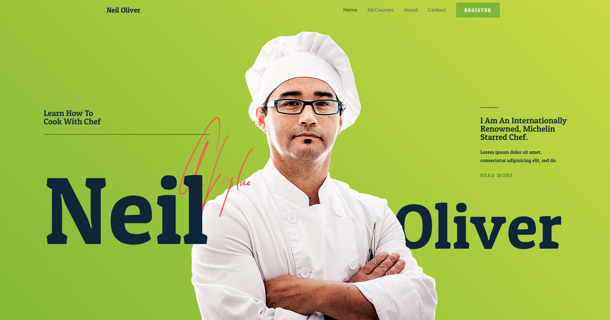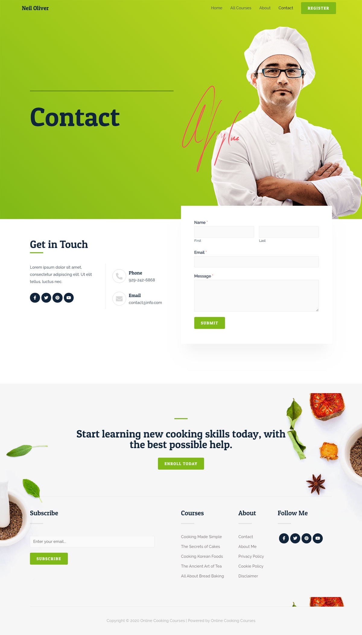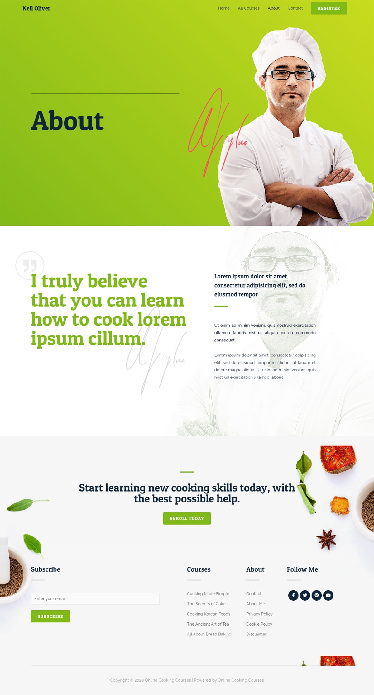 在线烹饪课程模板采用彩色标题,具有鲜明的图像和标题,能够产生立竿见影的效果。这是一个引人入胜的设计,展开成一个明亮的白色页面,有许多选项来概述课程并使用图像进行销售。