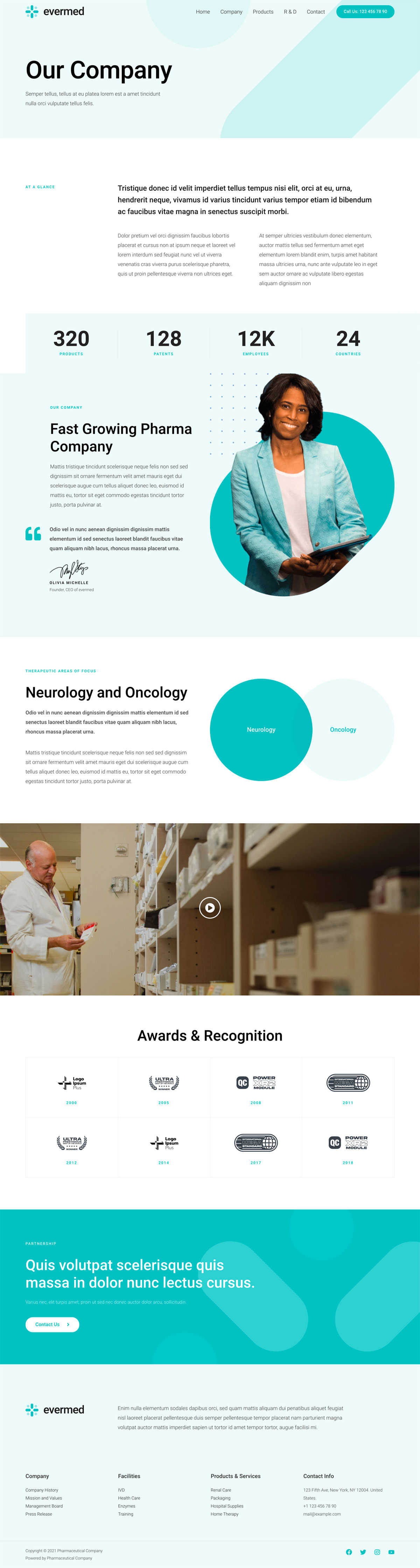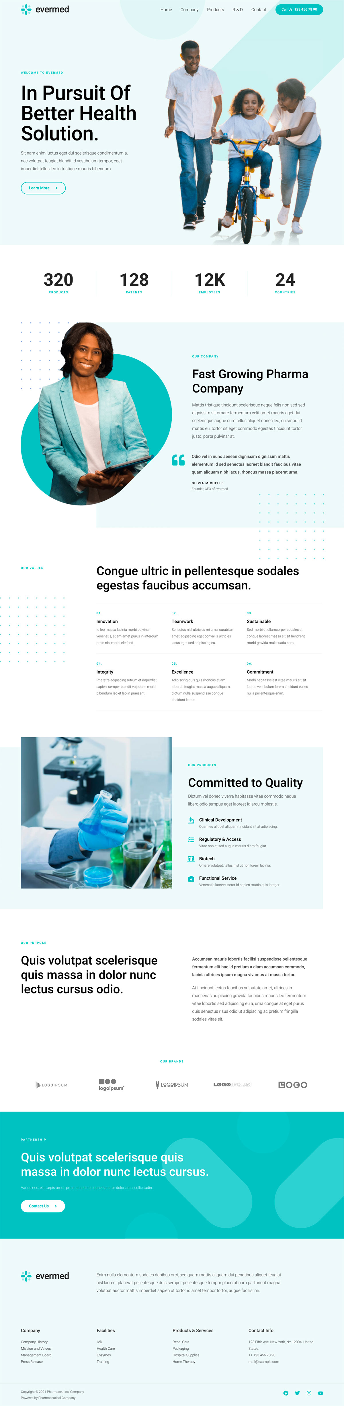 这家制药公司的模板有一种轻松、包容的感觉,它使用与医疗感觉相关的颜色来激发信心和传达意义。现代字体、动画和优质图像与可定制的内容区域相结合,讲述您的故事。