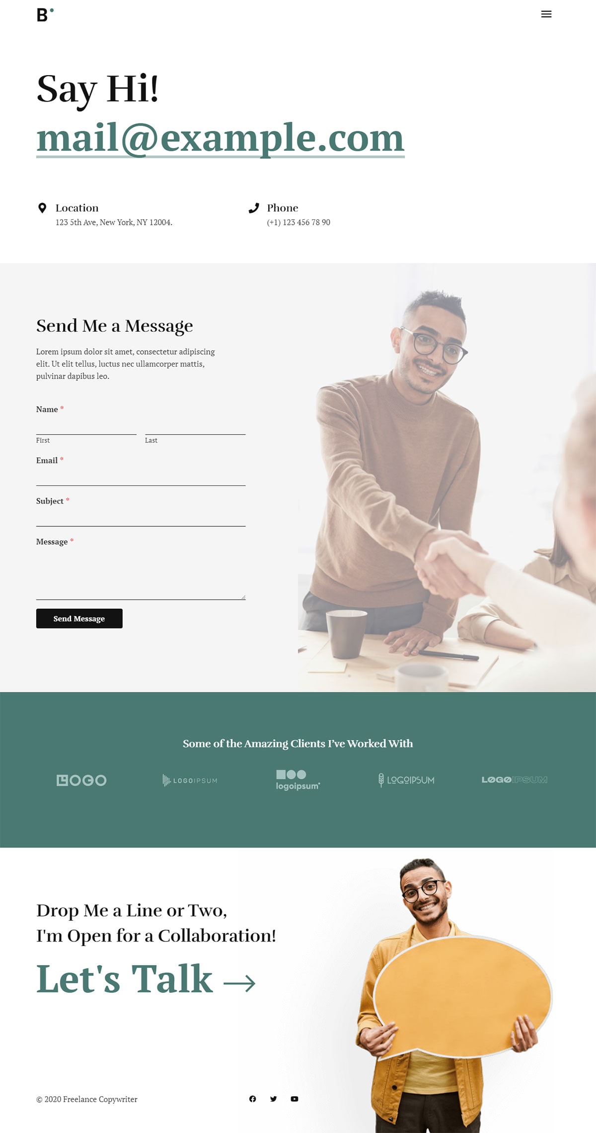 自由撰稿人模板可用作商业网站或在线简历,具体取决于您的配置。这是一个轻松的设计,有许多白色空间和平静的补色。