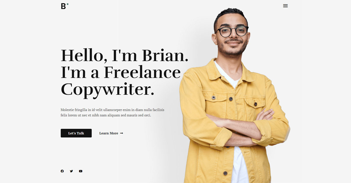 自由撰稿人模板的主要功能自由撰稿人可配置的简历或商业网站使用平静的颜色和白色进行简单的设计大量可定制的内容区域组合页面已经设计好并准备就绪与领先的页面生成器完全兼容