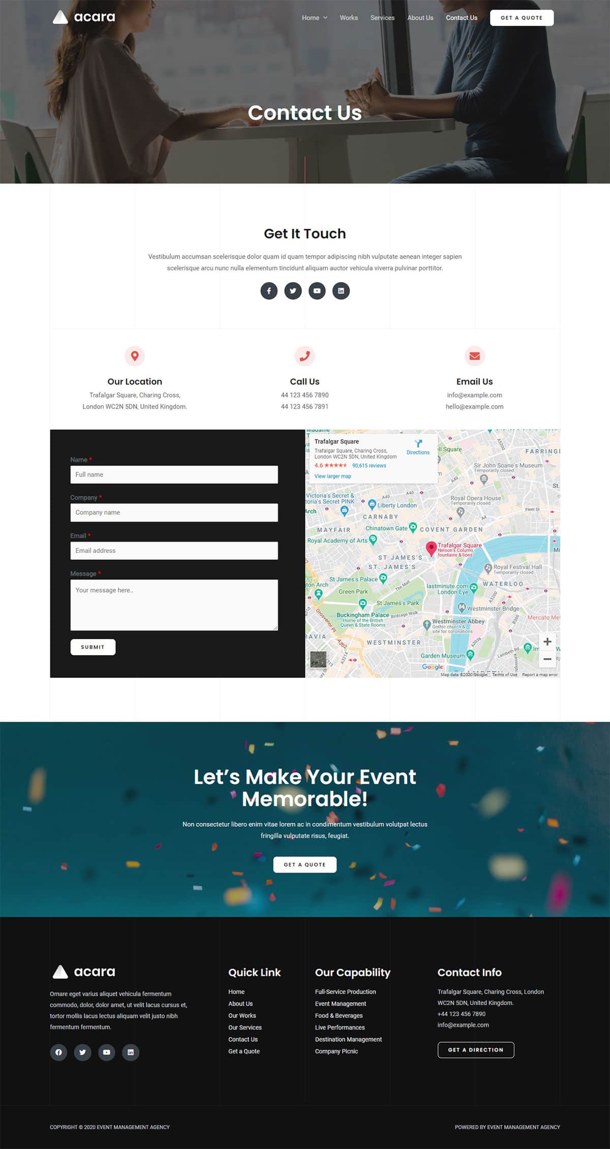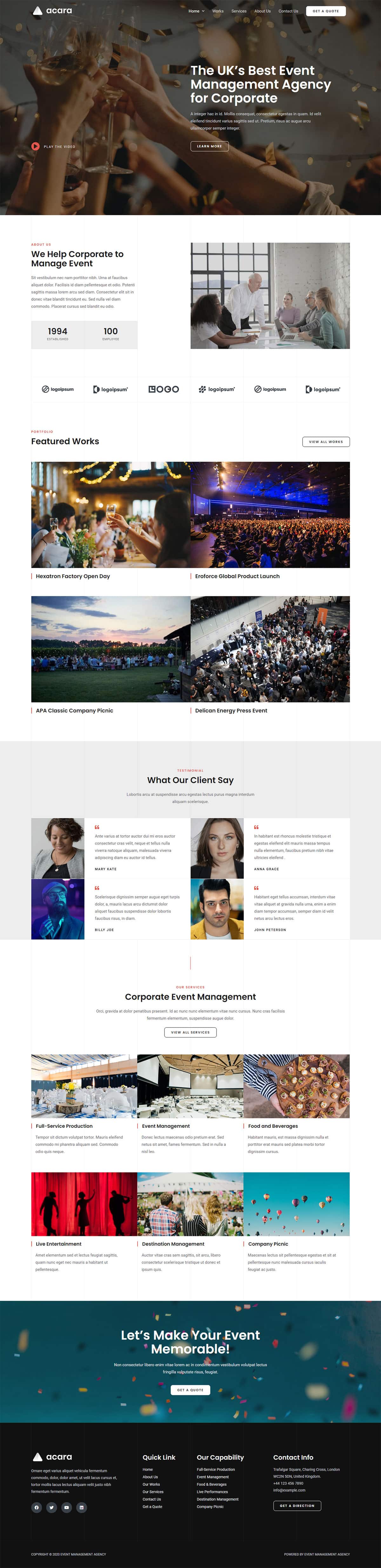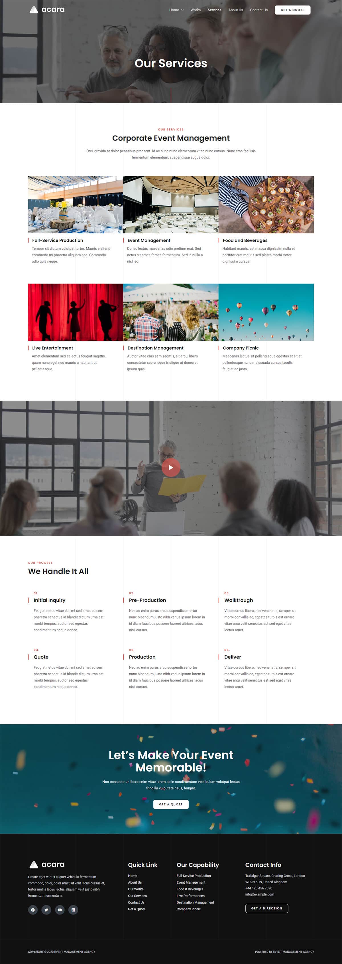 活动管理代理模板的主要功能专业业务模板是活动管理公司的理想选择产品和服务的大量内容区域支持视频和音频标题展示往届活动的活动组合部分与领先的页面生成器完全兼容