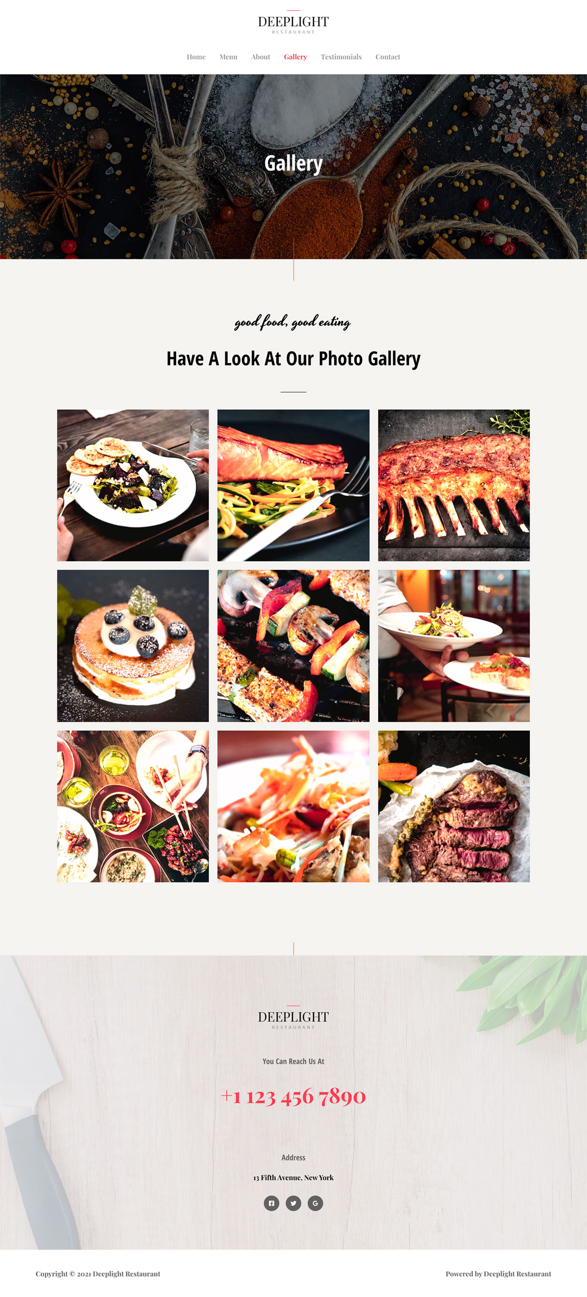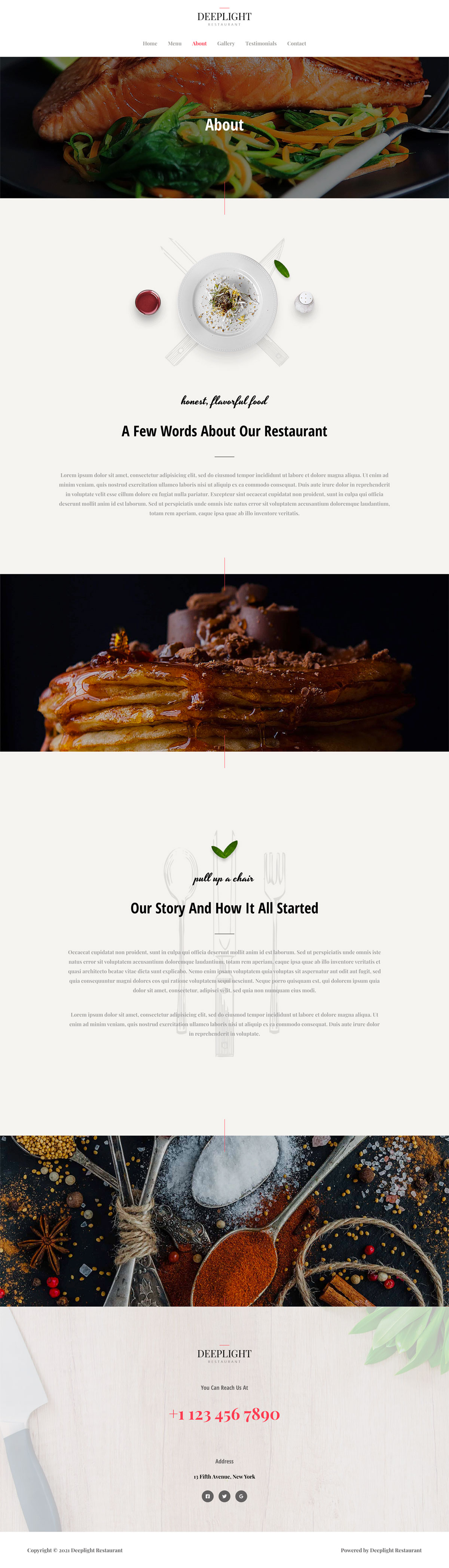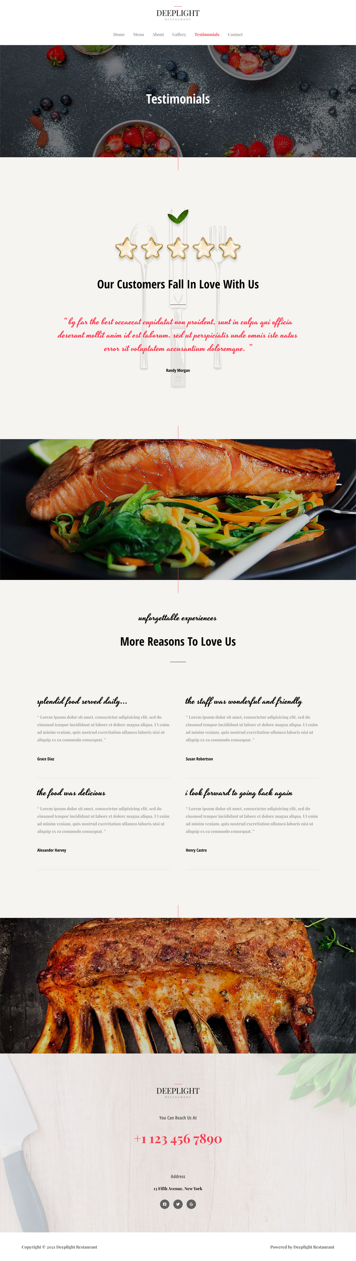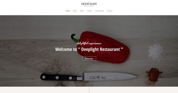 Deeplight餐厅模板的主要特点通过菜单、图像和证明的部分,具有现代风格的现代设计插图鼓励您向下滚动与食品行业相关的其他页面与领先的页面生成器完全兼容