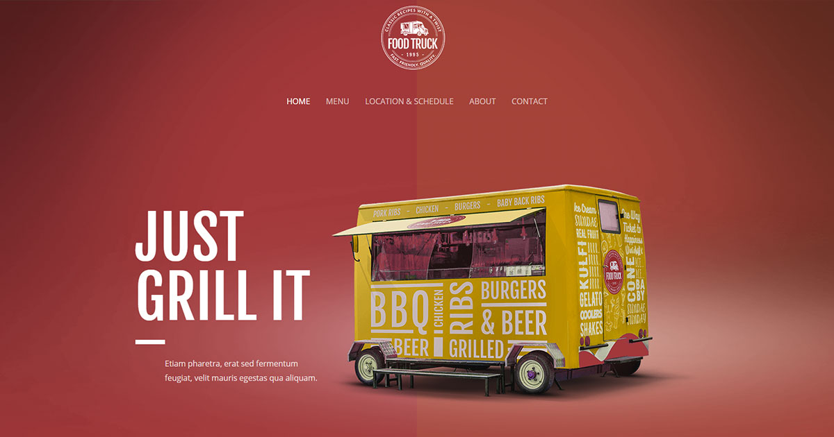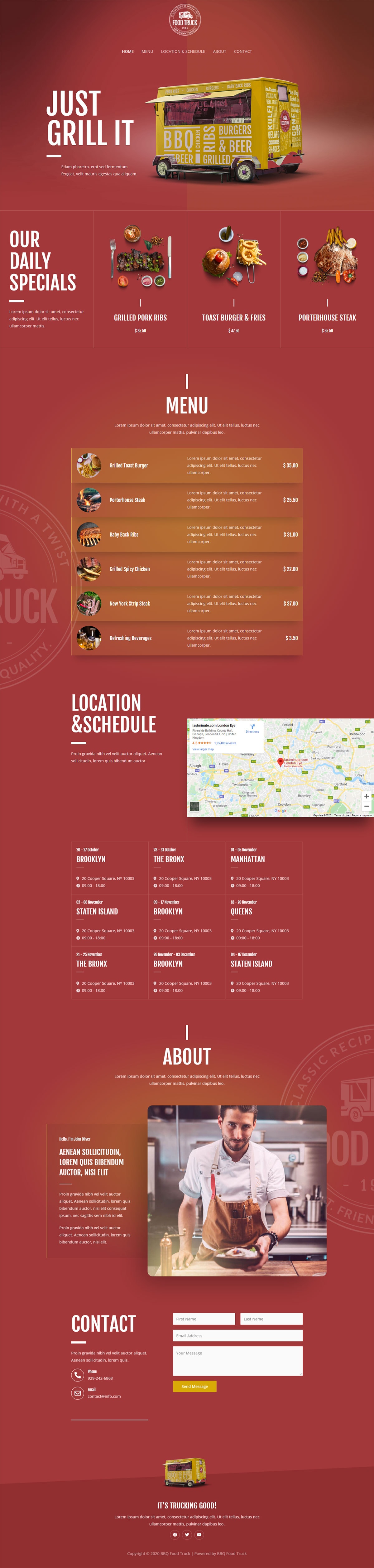 BBQ快餐车模板色彩鲜艳,引人入胜。这是一个全屏模板,有一个巨大的标题图像,食品车在前面和中间,还有描述性的标题。主页包括菜单、时间表和其他有用的内容。