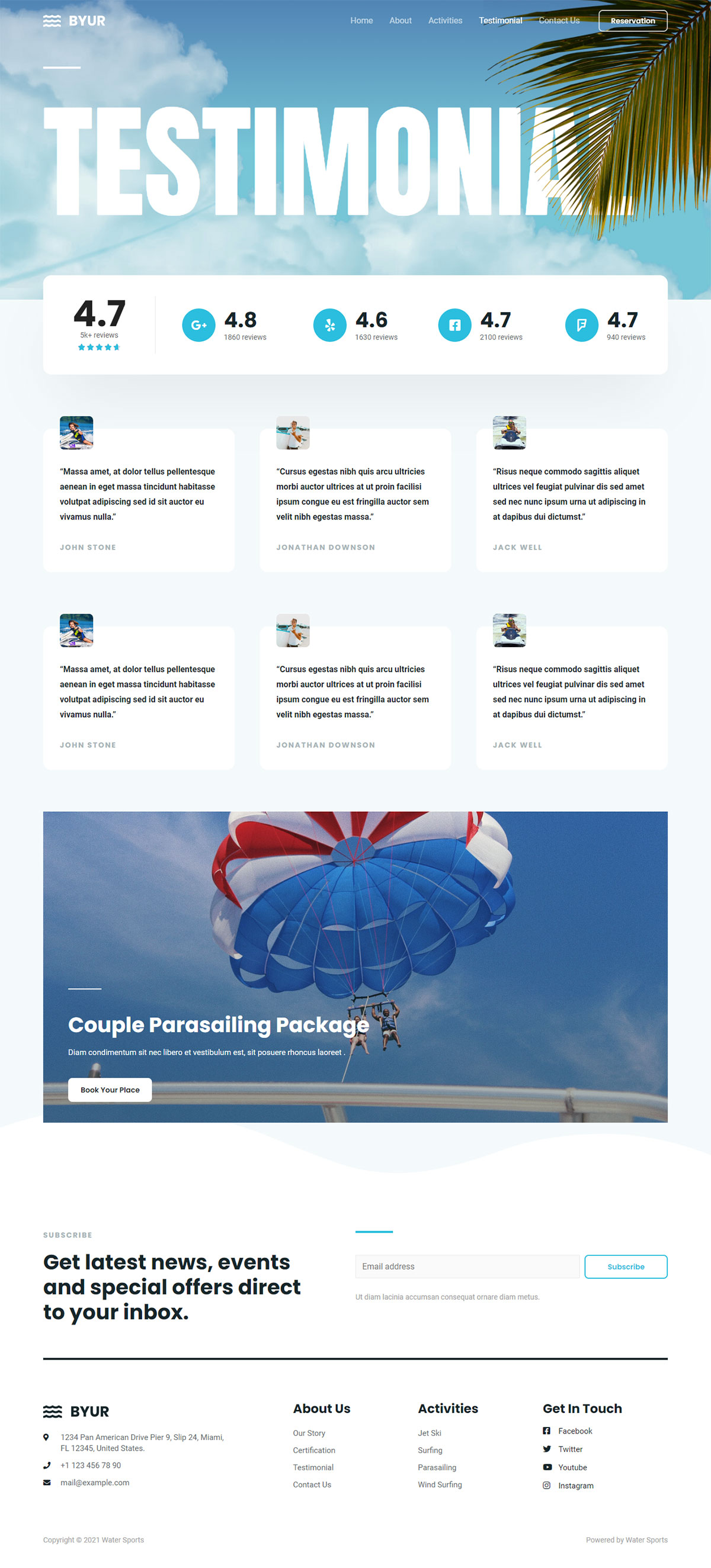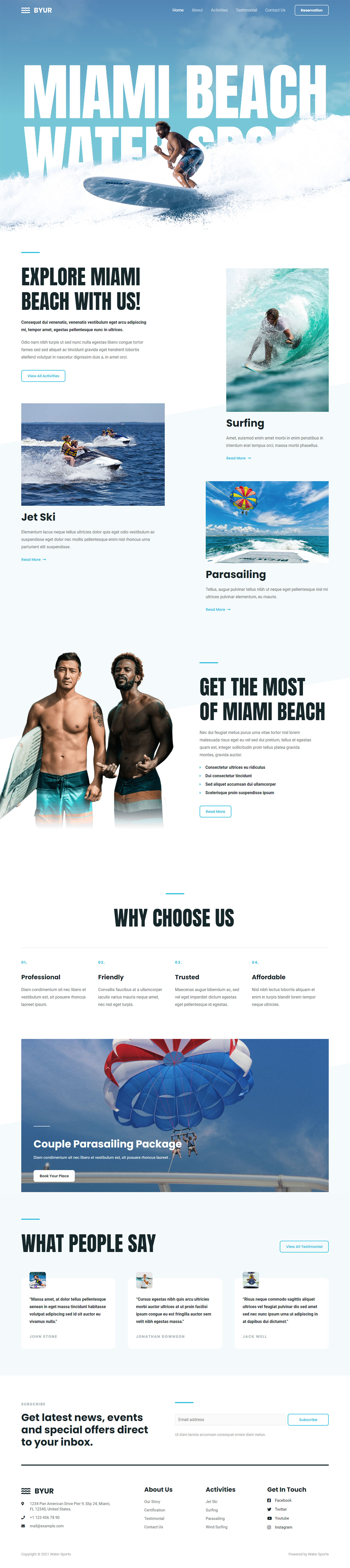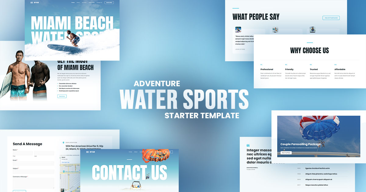 现场预览水上运动模板轻盈、明亮、充满活力,就像它所代表的水上运动一样。这是一个即时吸引人的模板,在主页上有全屏标题,打开后是白色背景和无边框的内容区域。