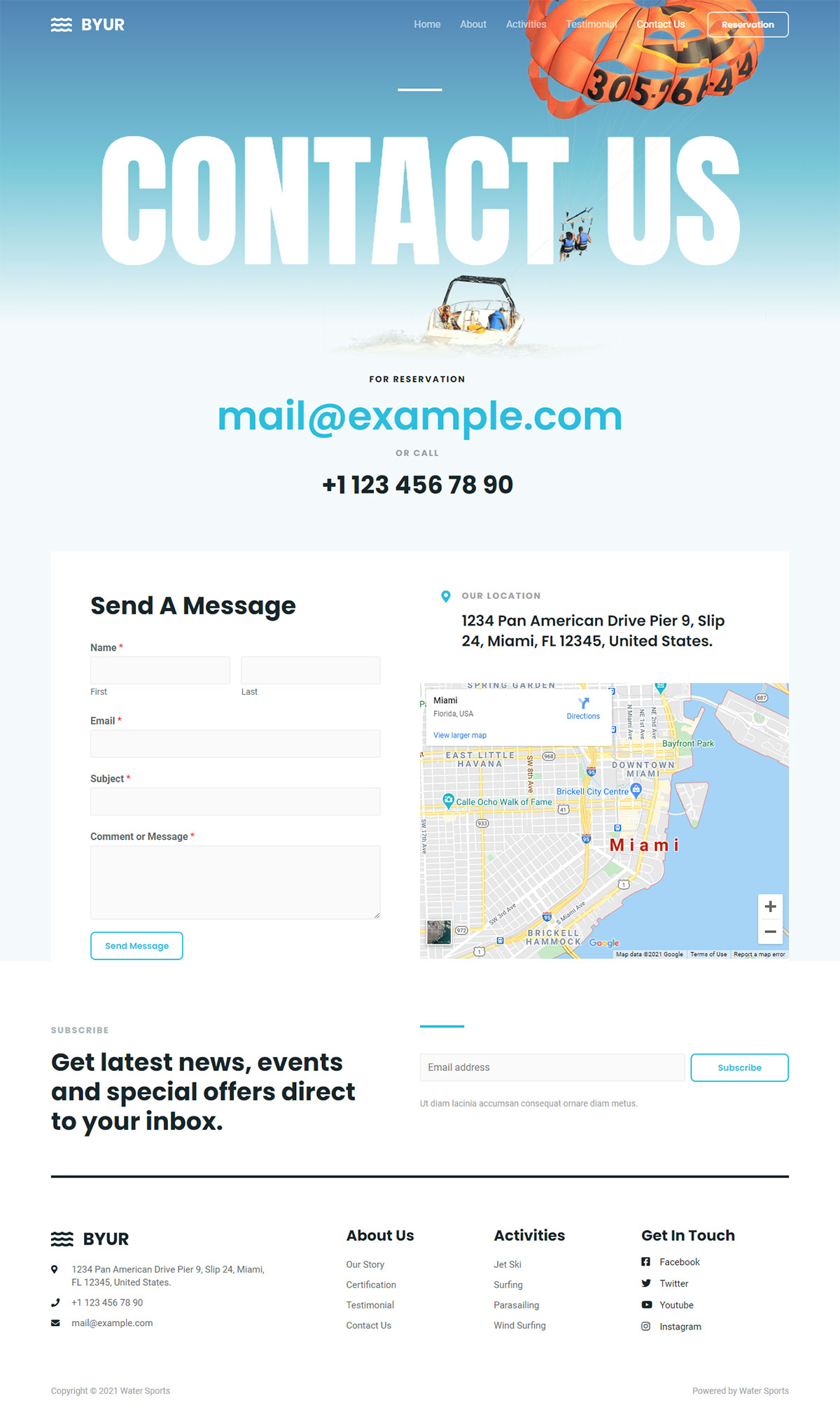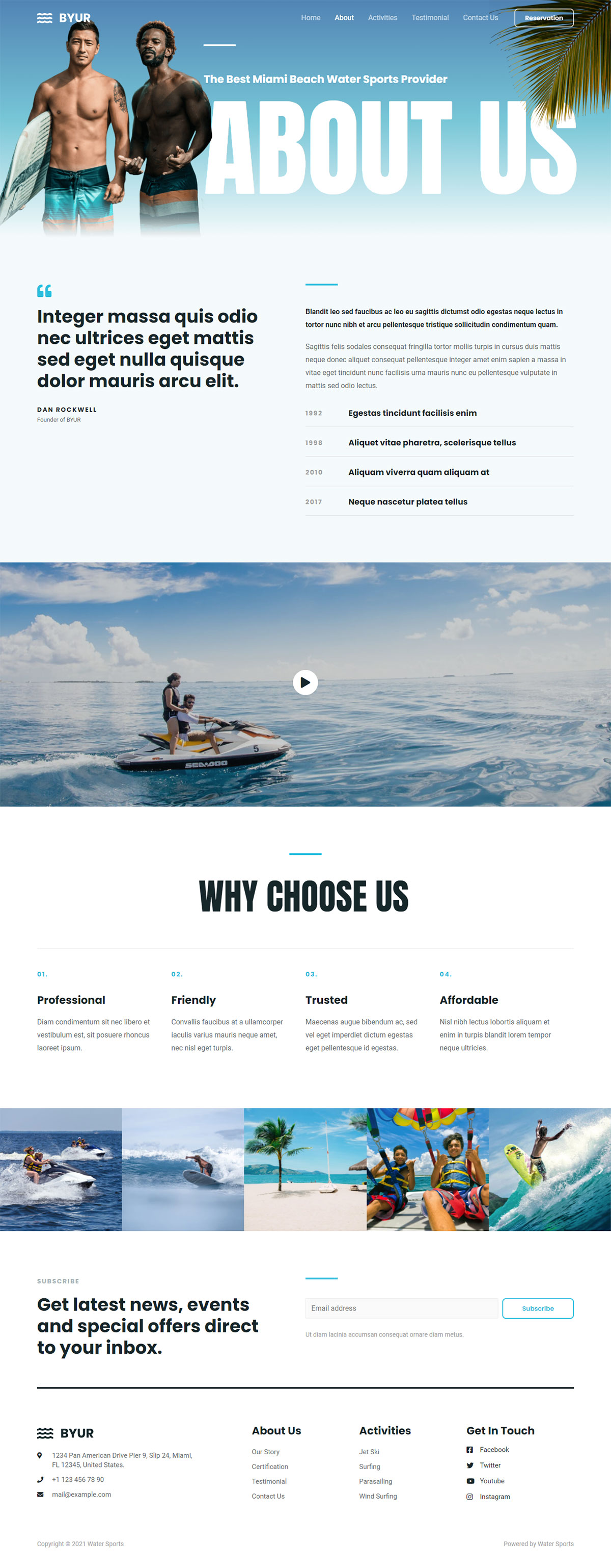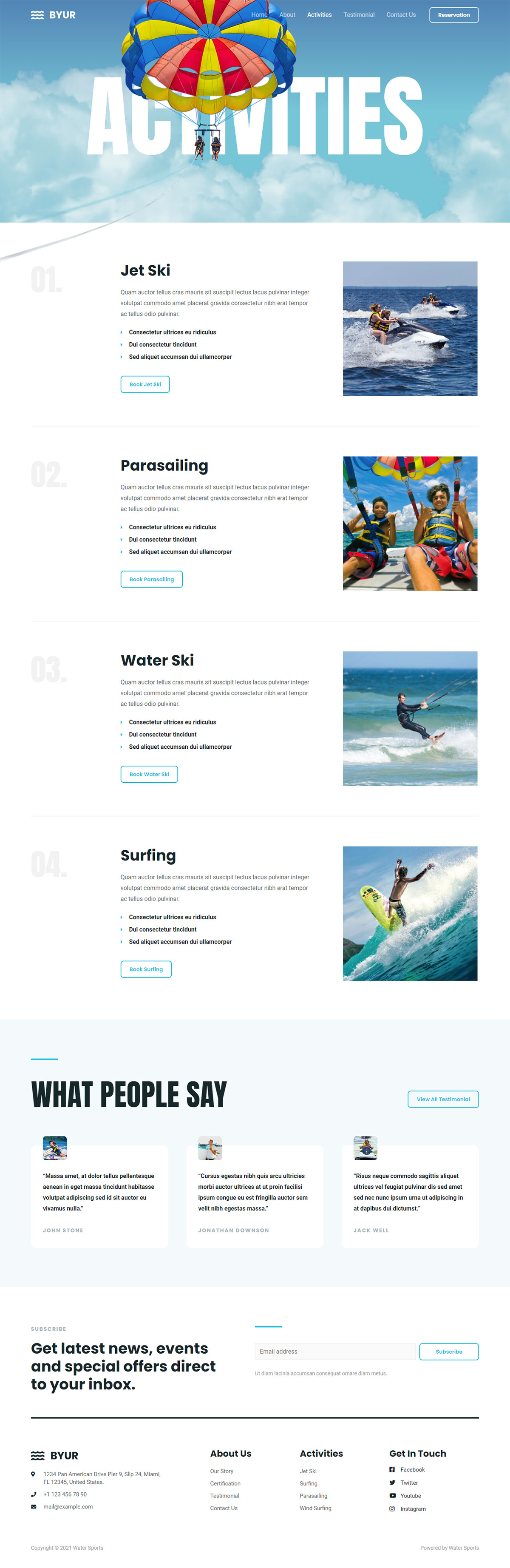 这是一个现代的设计,具有现代的字体,高质量的图像,可定制的内容区域和有吸引力的页眉和页脚。虽然是为水上运动设计的,但它可以很容易地定制,以适应多种类型的业务。