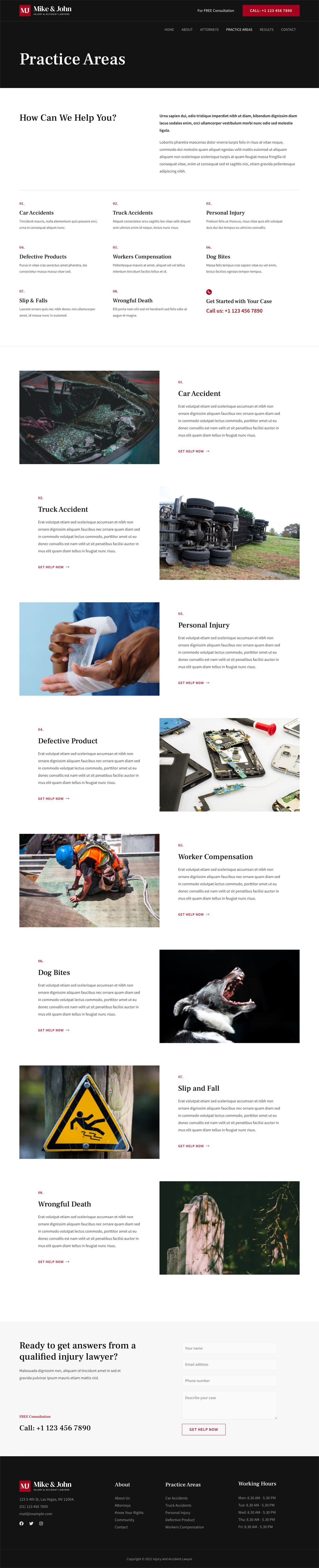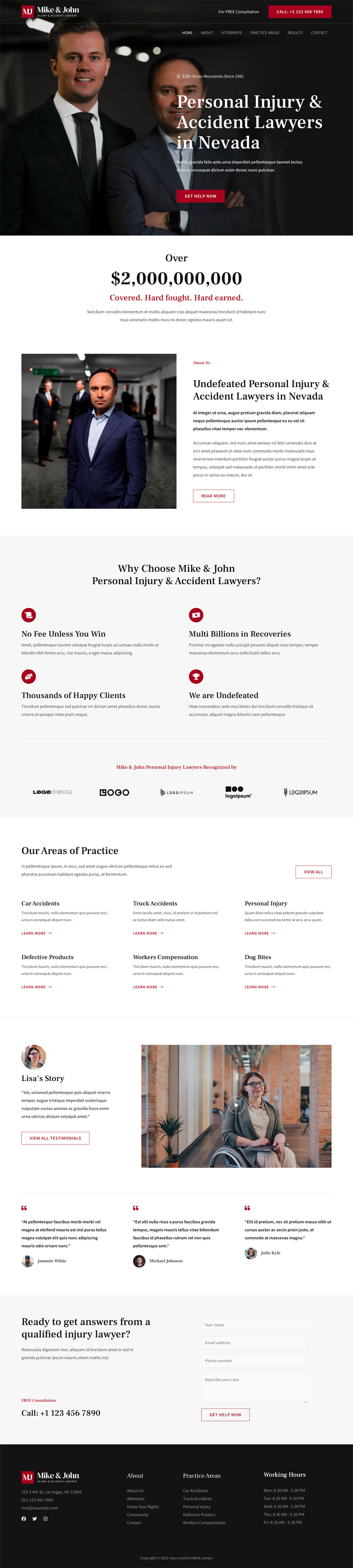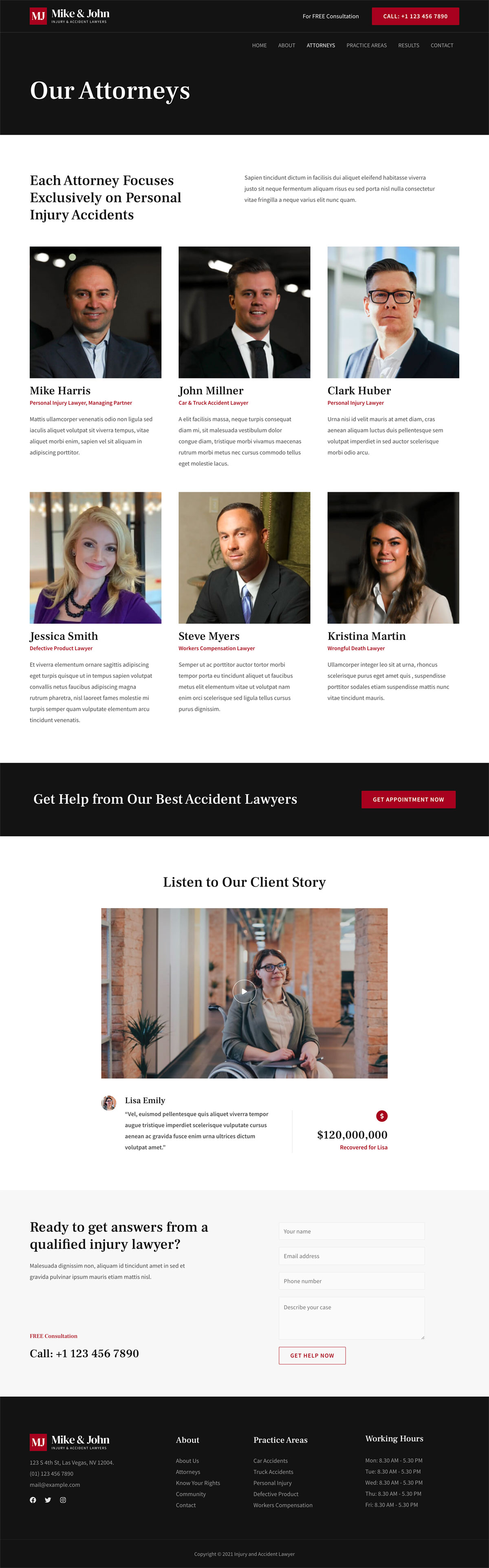 受伤和事故律师模板是一个严肃的业务模板,非常适合律师事务所、律师和法律行业。它使用明暗对比强烈的色彩设计来建立权威和信任。