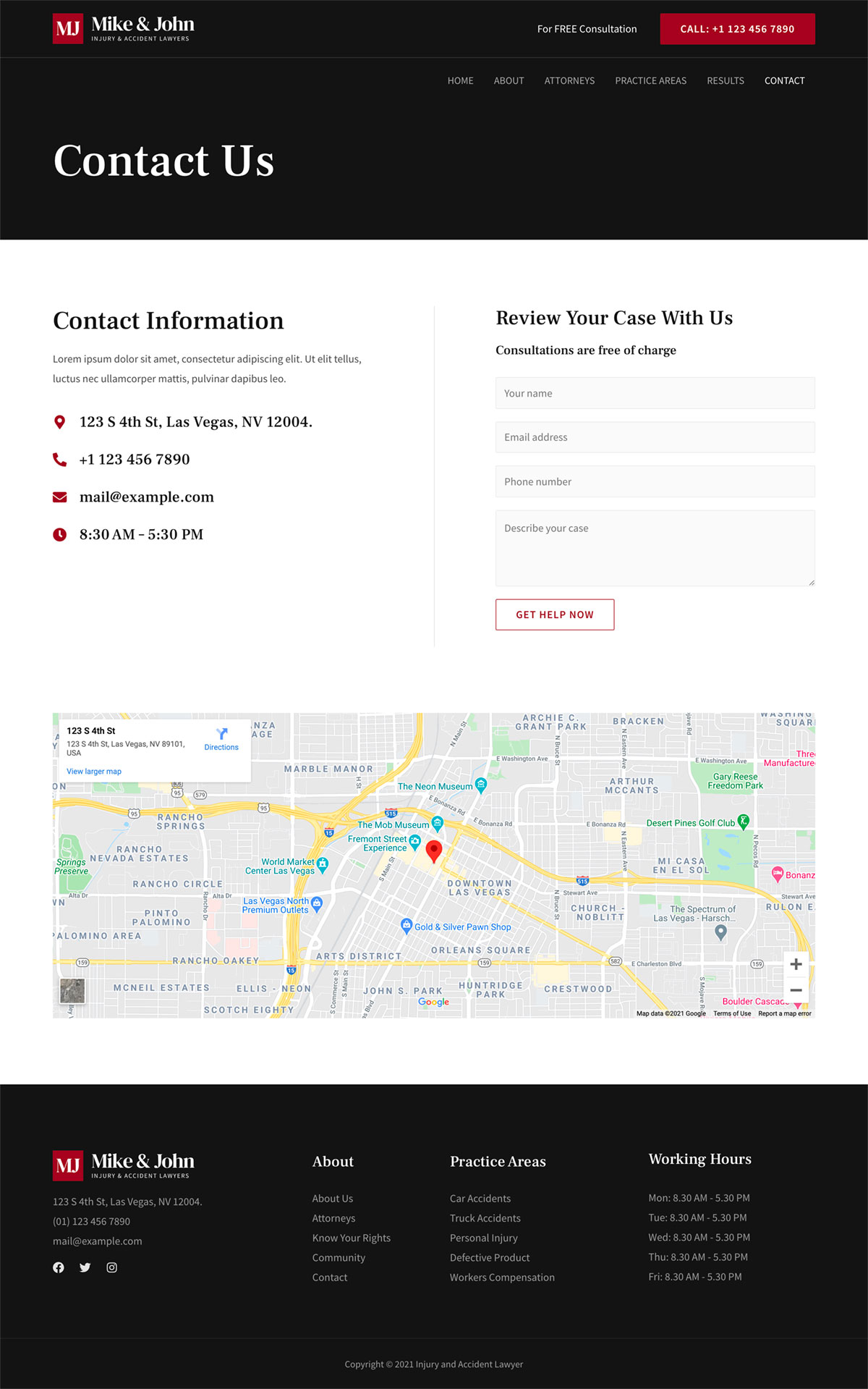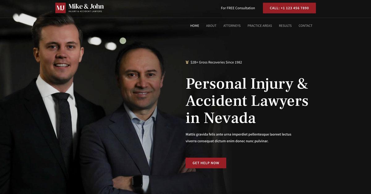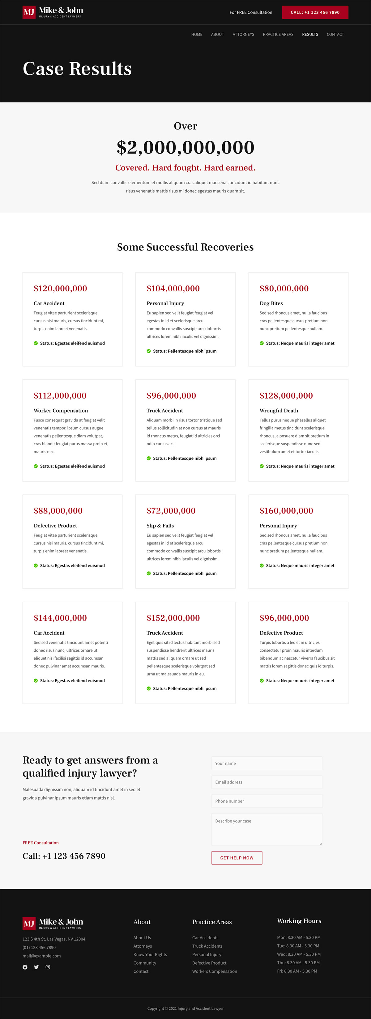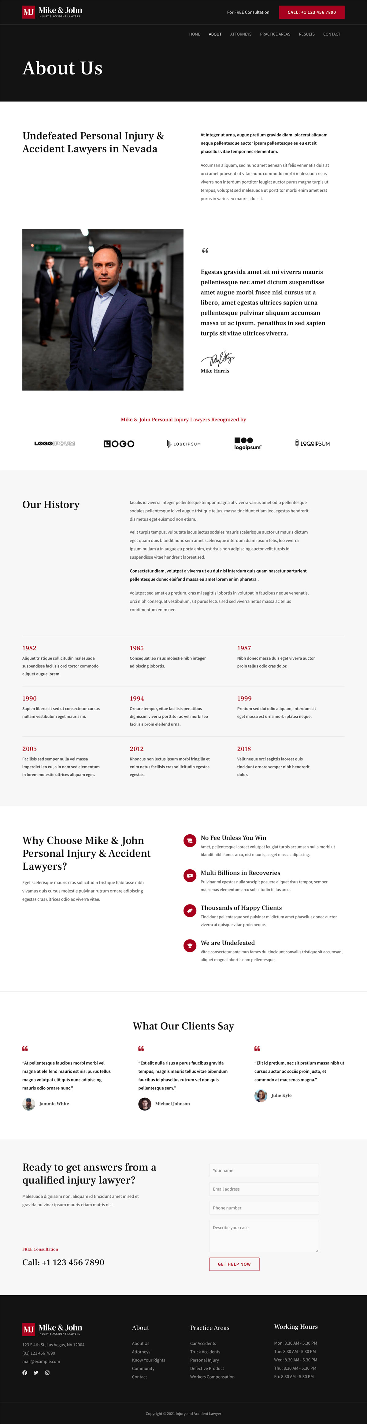 受伤和事故律师模板是一个严肃的业务模板,非常适合律师事务所、律师和法律行业。它使用明暗对比强烈的色彩设计来建立权威和信任。