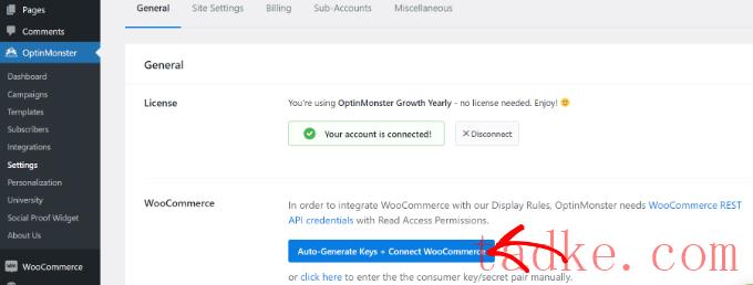 您可以访问OptinMonster»设置从WordPress仪表板上下载。在“常规”选项卡下,点击“自动生成密钥+连接WooCommerce”按钮。