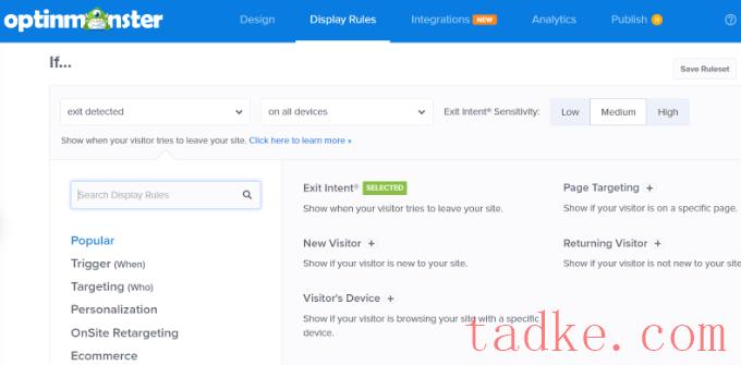 继续,点击顶部菜单中的“Display Rules”标签。OptinMonster将显示您可以使用的显示规则集列表。