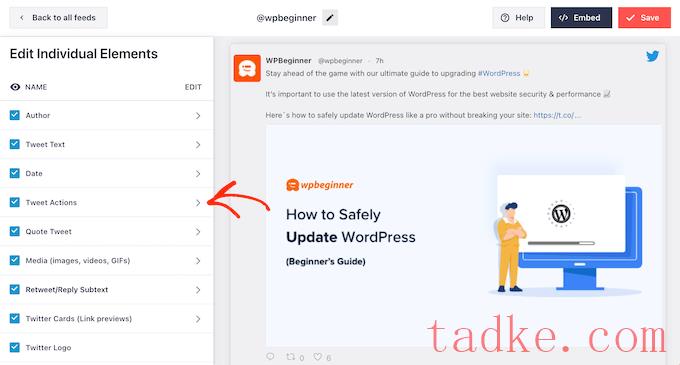 之后,返回到主Smash气球设置屏幕,并选择‘推文’。在这里,你可以选择‘Tweet Style’或‘编辑单个元素’。