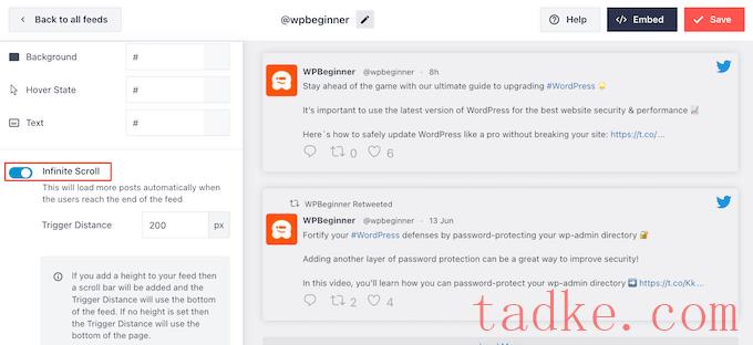 另一种选择是启用无限滚动,这样当访问者到达提要的末尾时,新的推文就会自动出现。这会鼓励访问者浏览更多你的推文,并可能获得一些额外的转发量。