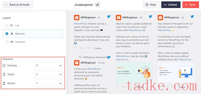在这里,您可以更改提要的高度和访问者最初看到的推文数量。还可以在网格、砖石或旋转木马布局之间切换。