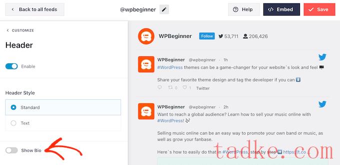 默认情况下,Smash Balloon会在提要中添加一个“标准”标题,其中会显示一个“关注”按钮和你的简历(如果有)。