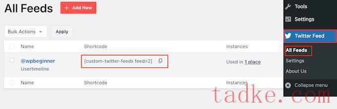 要获取此信息,请访问提要»所有提要并复制“短码”栏中的代码。您需要将此代码添加到您的站点中,因此请将其记下来。