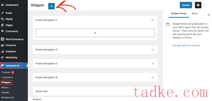 只需转到外观»小工具在WordPress仪表板中,然后点击蓝色的‘+’按钮。