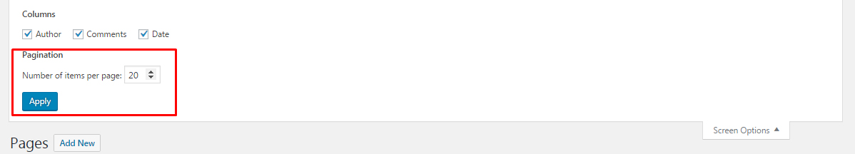 如果您想增加单个页面上显示的项目数量,只需选择位于 WordPress 仪表板右上角的“屏幕选项”选项卡即可。选择您想要显示的详细信息,并设置您想要在单个屏幕上访问的页面数。完成后,只需点击“应用”即可。