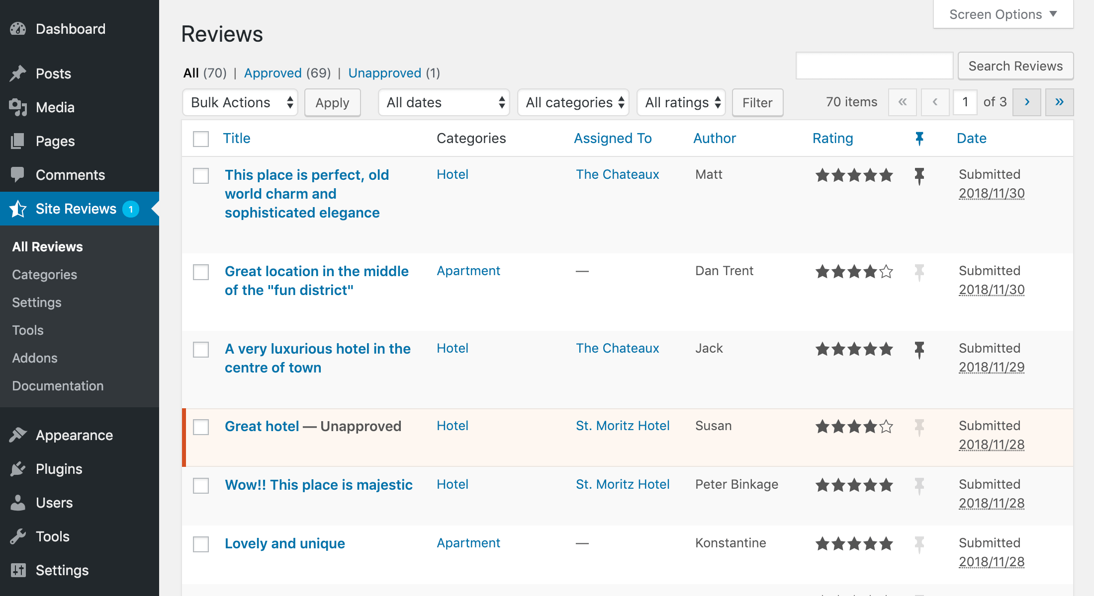 点击下载 网站评论 插件描述 网站评论需要PHP v5.6或更高版本! 网站评论允许您的访问者在您的网站上提交1-5星评级的评论,类似于您在TripAdvisor或Yelp上的评价。 该插件提供了块,短代码和小部件,以及完整的文档。 您可以固定最佳评论,以便始终首先显示,在发布新评论之前需要获得批准,要求访问者登录以撰写评论,在新提交时发送自定义通知, 以及更多。 关注Github上的插件开发。 当前功能 积极开发和支持Ajax评论评论用于垃圾邮件验证的阿基斯特集成亚语言支持分享评论到帖子/页面IDBackup并恢复插件设置贝叶斯排名为具有指定评论的帖子(可用于WP_Query排序)使用自定义可配置块的块编辑器支持清晰且易于配置的界面完整文档可配置的小部件自定义通知(包括Slack支持)轻松设置和实现在提交formPlugin样式中实现的Hypypot(垃圾邮件陷阱),以匹配常用主题,表单插件和CSS frameworksPolylang多语言网站的集成Google搜索结果中的评分片段(schema.org JSON-LD标记)相对日期评论头像(gravatar.com)评论黑名单评论类别评论回复评论摘要经典编辑器中的短代码按钮下拉代码:在帖子内容和模板中显示评论模板翻译a ny插件text使用Google的Invisible reCAPTCHA提交表单WordPress.org支持 截图 所有评论页面的视图 A “编辑评论”页面的视图 “站点评论”视图>设置页面 网站评论视图>可以导出/导入插件设置的工具页面 网站评论提供了有关插件的广泛文档 网站评论支持块编辑器,并包含每个短代码的块 网站评论在经典编辑器中添加一个下拉列表,可轻松添加任何短代码 网站评论小部件的视图 这是Slack通知的样子 安装 最低插件要求 如果您的服务器和网站不符合下面显示的最低要求,插件将自动处理ivate和通知将出现解释原因。 WordPress 4.7.0PHP 5.6 自动安装 登录WordPress仪表板,导航至“插件”菜单,然后单击“添加新”。 在搜索字段中,键入“站点评论”,然后单击“搜索插件”。找到插件后,您可以查看有关它的详细信息,例如积分发布,评级和说明。您只需单击“立即安装”即可安装它。 手动安装 点击下载站点评论插件并通过您最喜爱的FTP应用程序将其上传到您的服务器。 WordPress codex包含有关如何执行此操作的说明。 常见问题 如何使用网站评论? 使用您网站上提供的短代码,小部件和块。请务必查看上面的屏幕截图并阅读插件菜单中包含的“文档”页面(安装后)。 我需要其他方面的帮助 所有文档都可以在插件的“文档”页面中找到。如果您的问题没有得到解答,请在 WordPress支持论坛中创建一个新主题。 评论