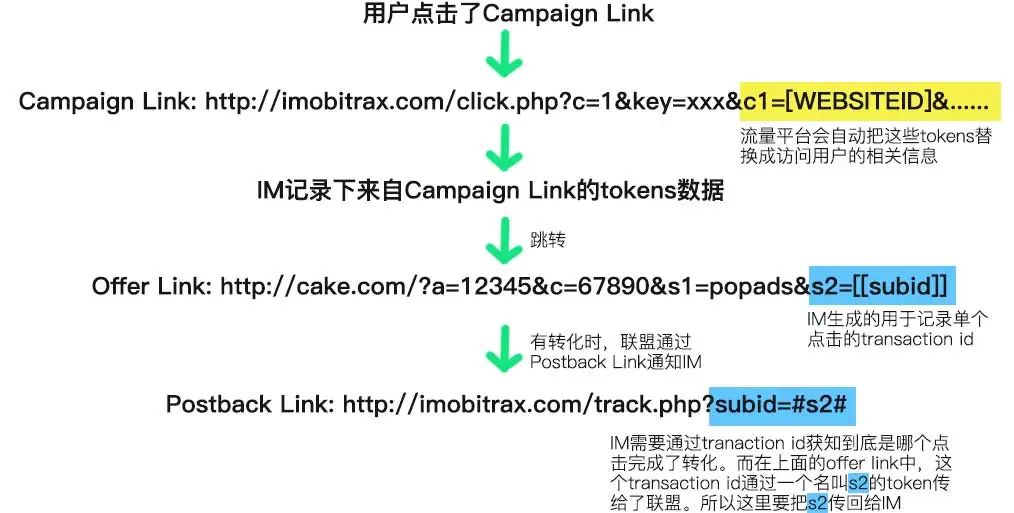 来源(某网站或APP)——流量平台(IMOBI,Adwords,Airpush)——跟踪系统(ImobiTrax、prosper)——联盟后台(yeahmobi,furthermobi)——广告主