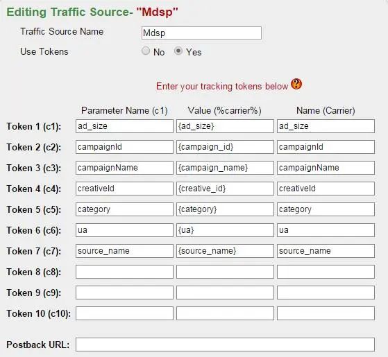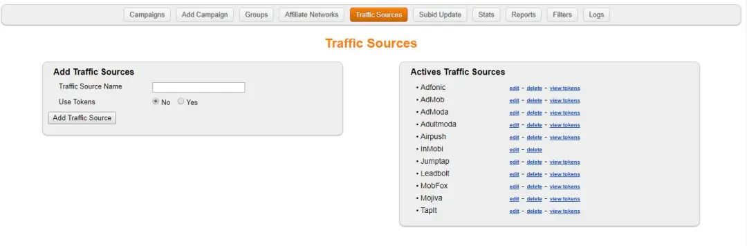 【Traffic Sources】菜单,然后【Add Traffic Sources】设置我们跑的流量平台,Token设置参数,这个是流量平台提供的。