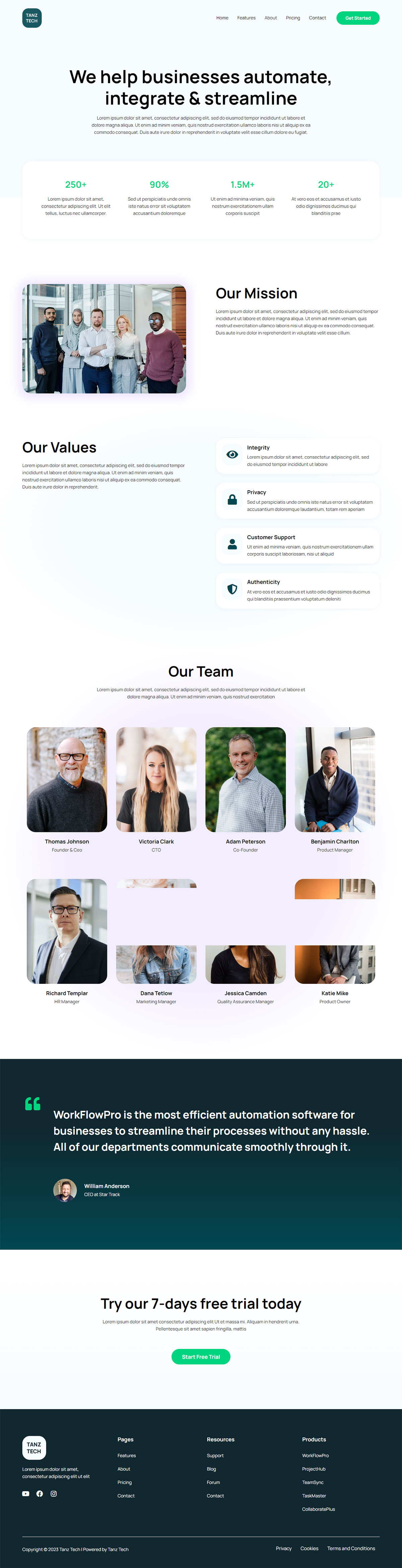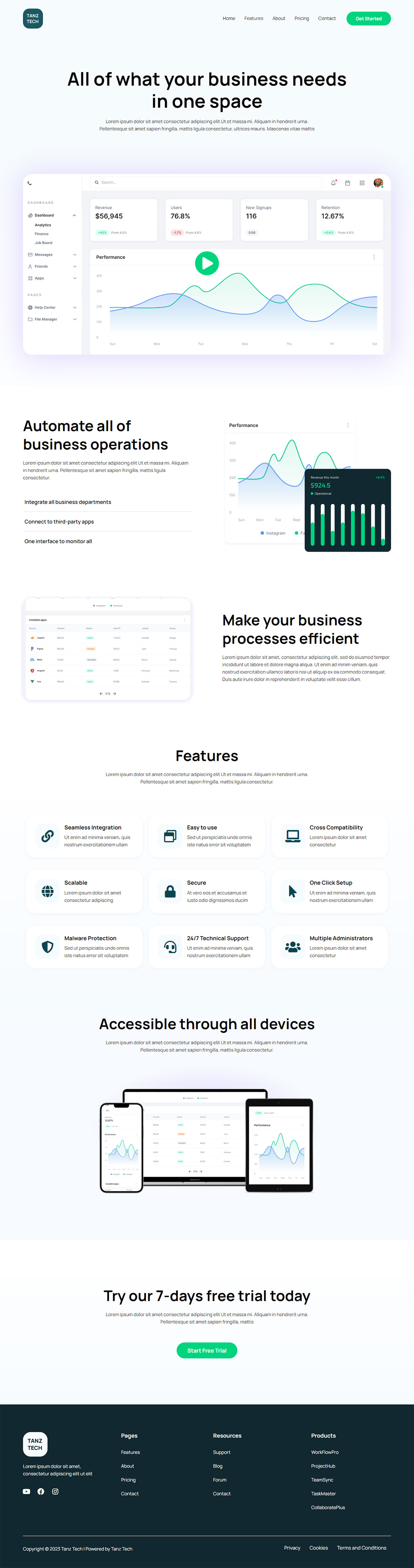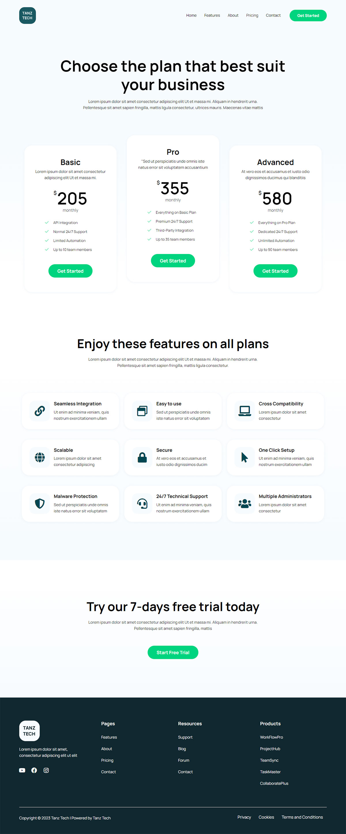 Tanz Tech模板是一个年轻的平面设计,非常适合机构和技术企业。它使用浅色、无衬线字体和图形来吸引你并讲述你的故事。这是一个优秀的设计,适用于任何类型的企业。
