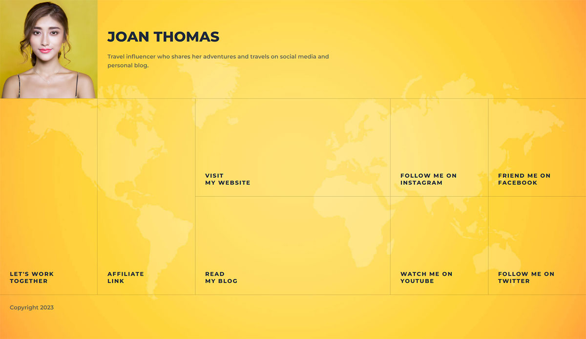 “旅行影响者简历”模板中链接的主要功能最小化设计,背景是引人注目的世界地图。完全可定制。使用您想要的颜色、字体和图片。移动就绪。链接部分适应任何屏幕的大小。与领先的页面生成器完全兼容。功能多样。根据需要扩展其功能。在您自己的域中使用它。