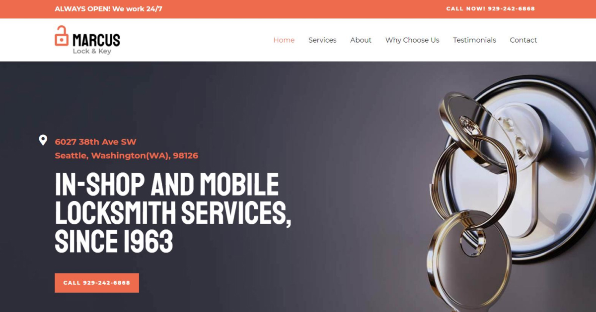 锁匠网站设计在白色背景上使用强烈的颜色和字体,旁边是强烈的图像,以产生影响。它包括基本服务部分,关于我们,评论和帮助你建立权威和信心的领域。锁匠吸引新业务所需的一切。