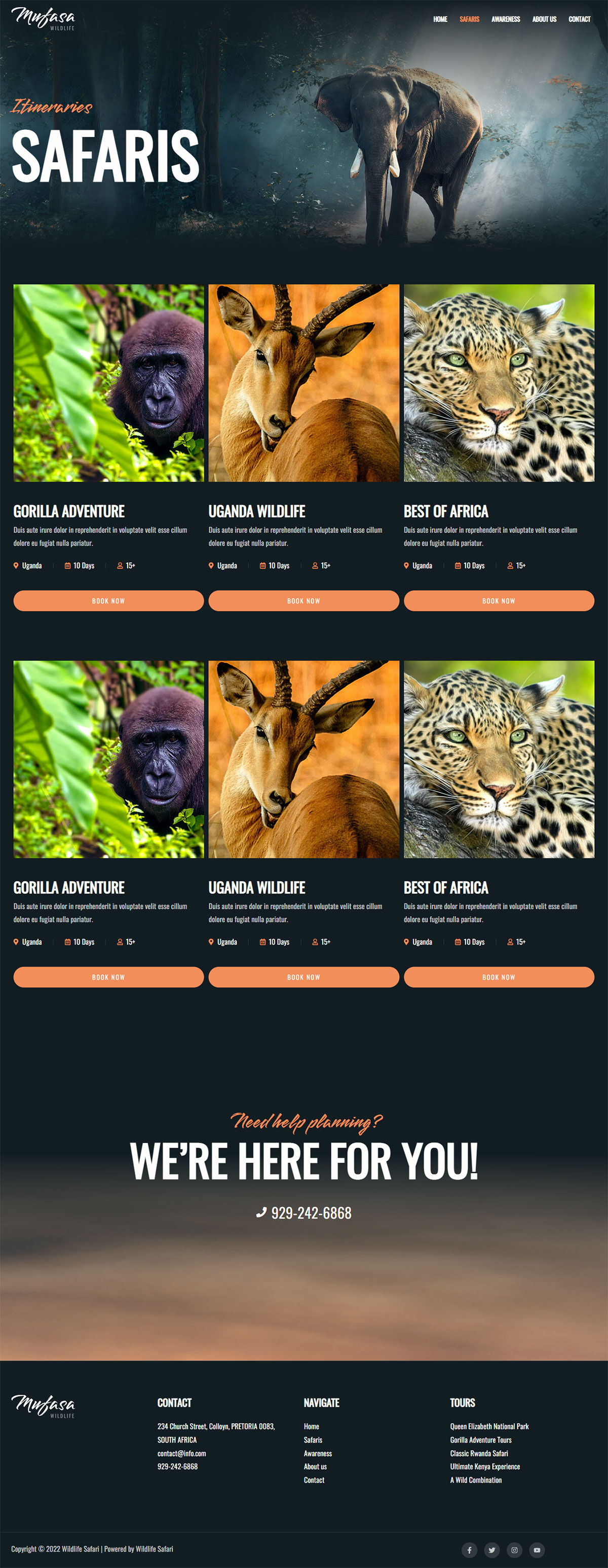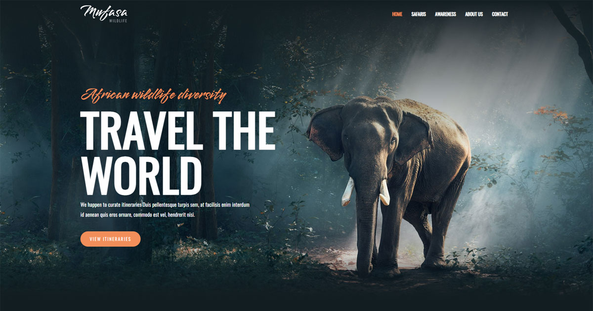 野生动物园模板的其余部分很好地使用了图像和字体。有出售体验或野生动物园假期的选项,有突出产品和优惠的页面以及热门目的地的背景。一切都可以完全定制!
