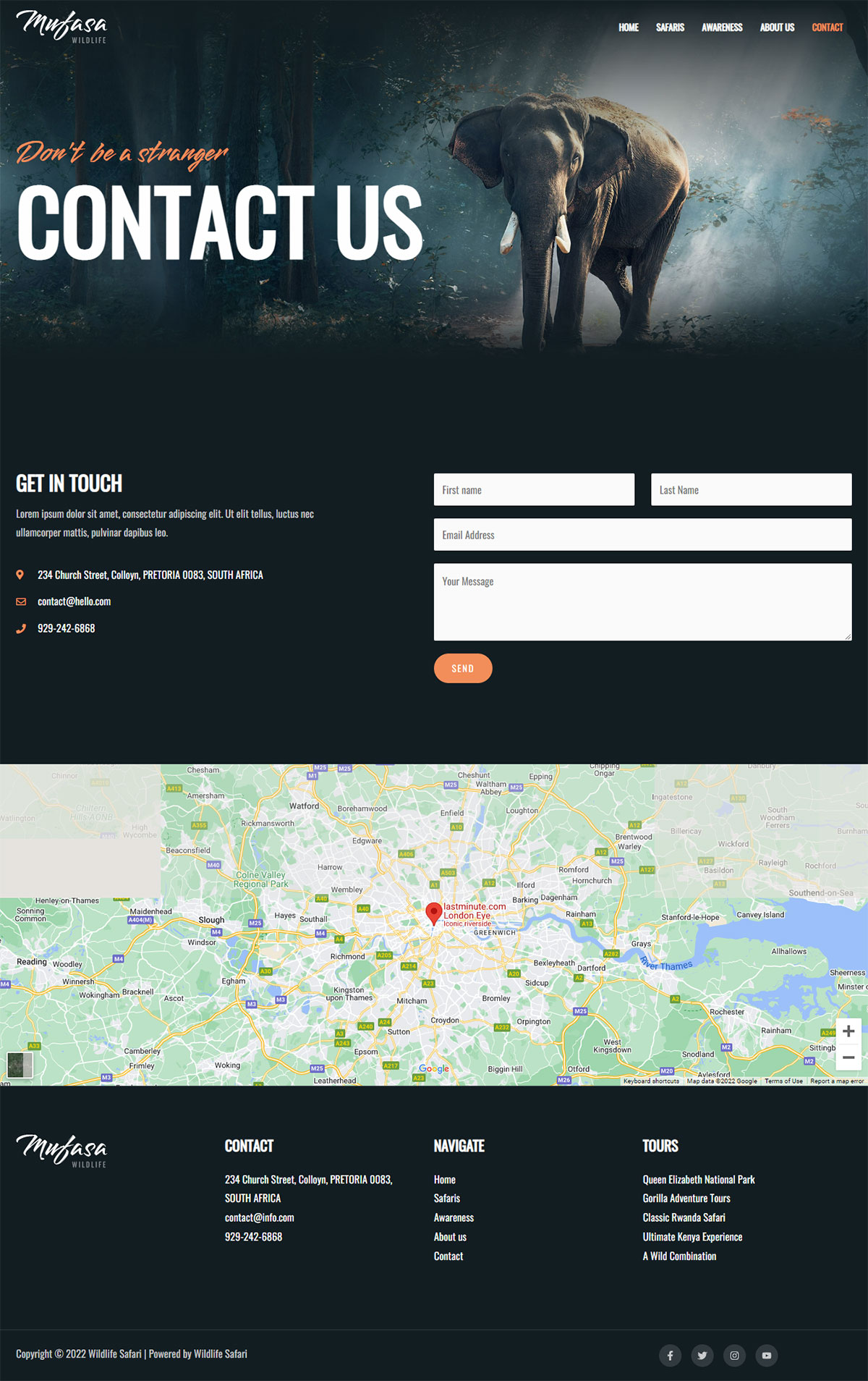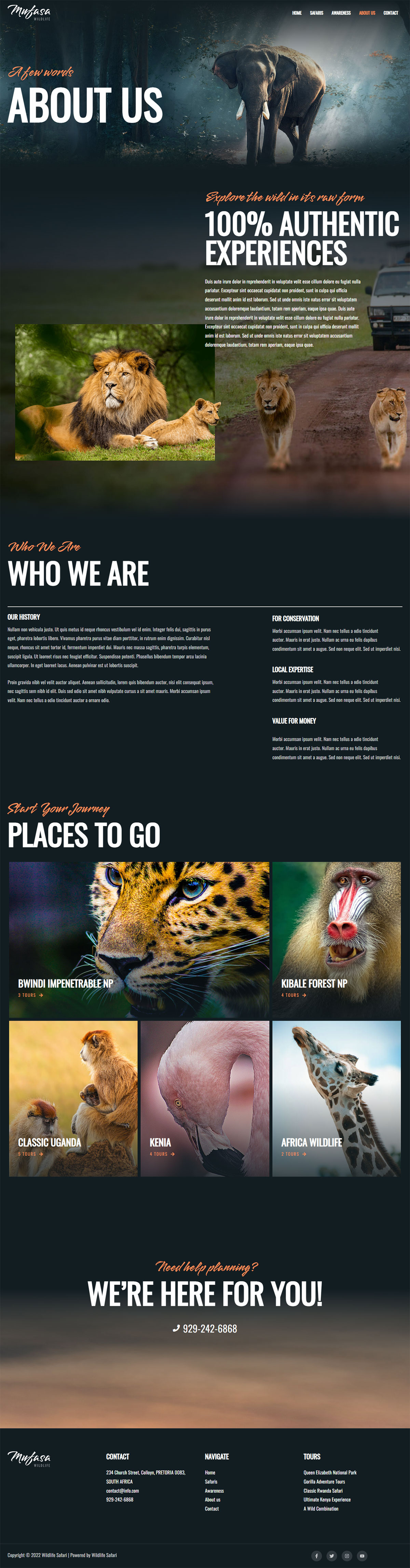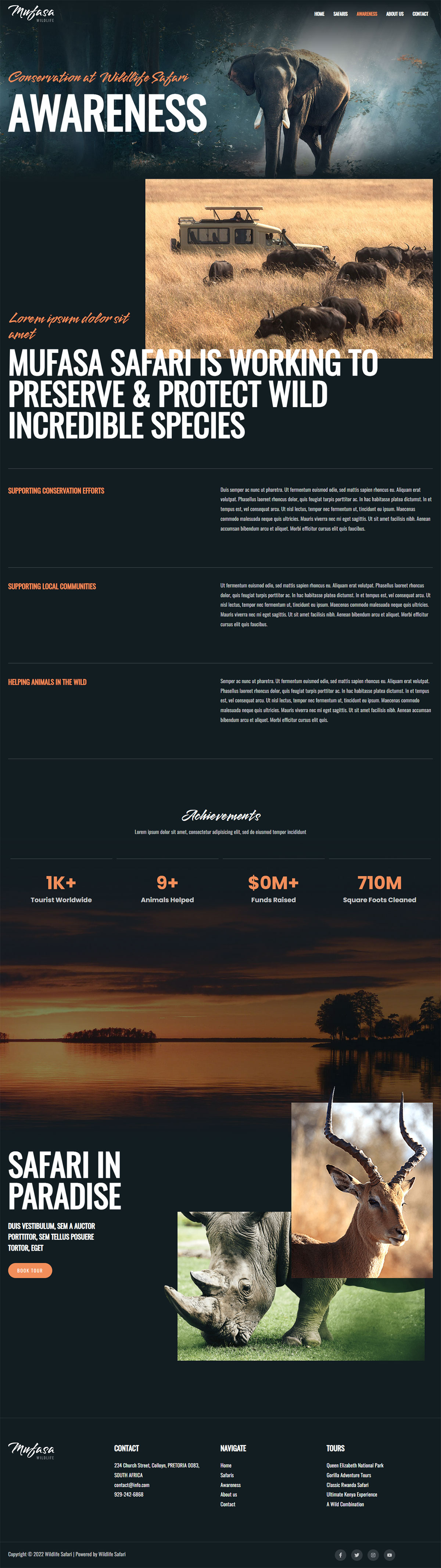 野生动物游猎模板的主要功能引人注目的野生动物游猎模板使用对比色的深色设计产生冲击力使用图像非常有效地帮助参与可以在任何地方添加可选的页面元素与领先的页面生成器完全兼容