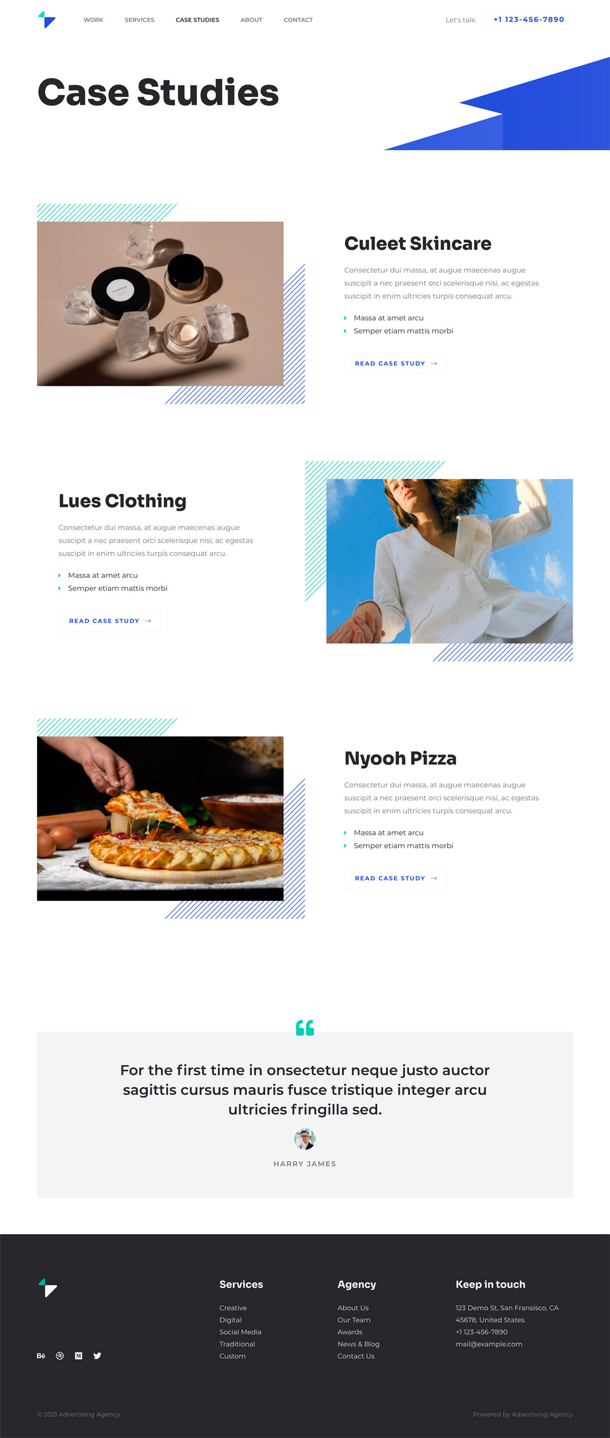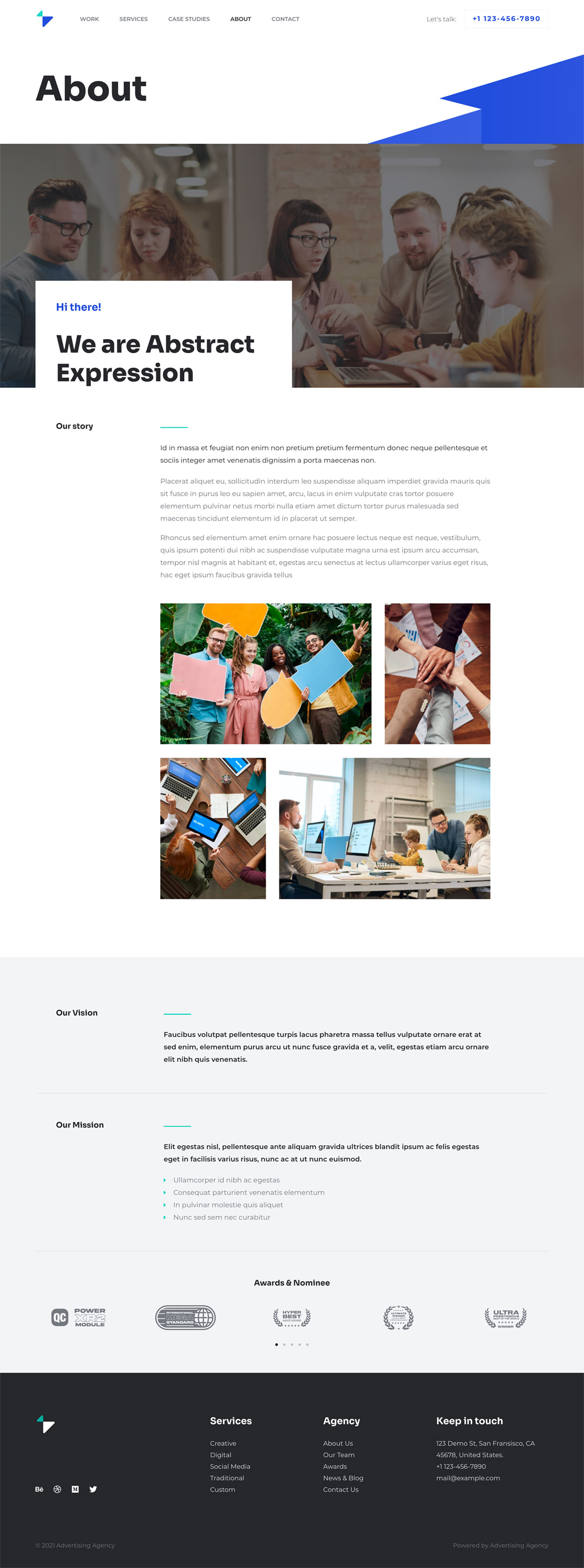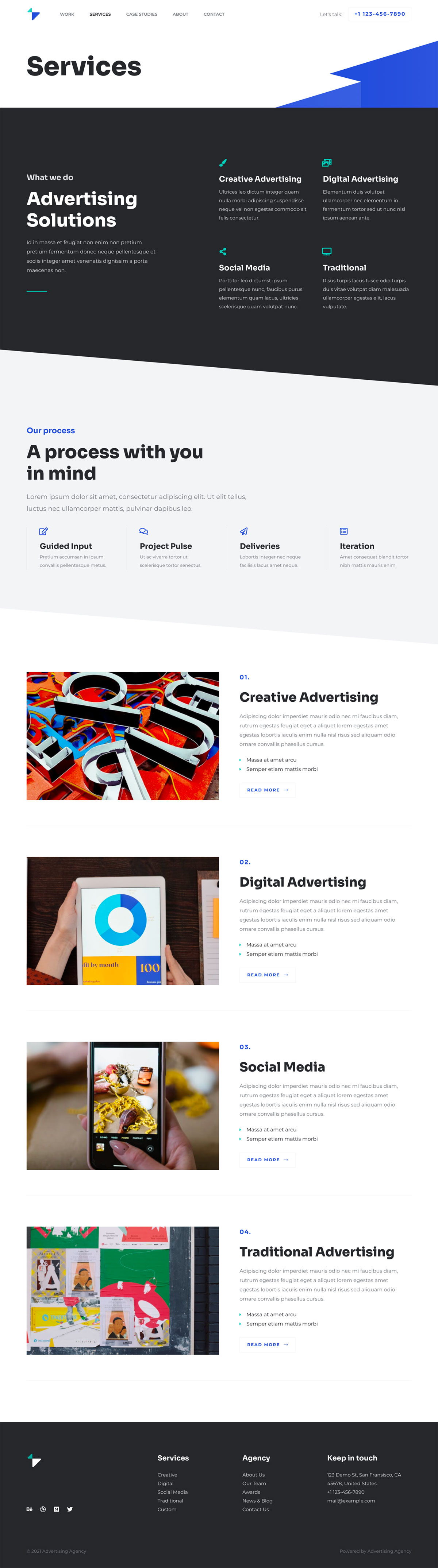广告代理模板的主要功能设计精美的网站模板,用于展示您企业的创意一个完全集成的模板,用于推广您提供的所有服务、案例研究、客户评论等在“关于”页面上添加您团队成员的照片一个功能齐全的联系表单,其中集成了Google maps专用页面,用于突出显示您已完成的项目和案例研究