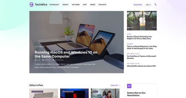 使用技术新闻模板建立一个技术网站,分享与技术、小工具、软件、应用程序、游戏等相关的最新趋势。干净整洁的设计将帮助你的网站访问者找到他们想要的东西,而不需要在成堆的信息中挖掘。