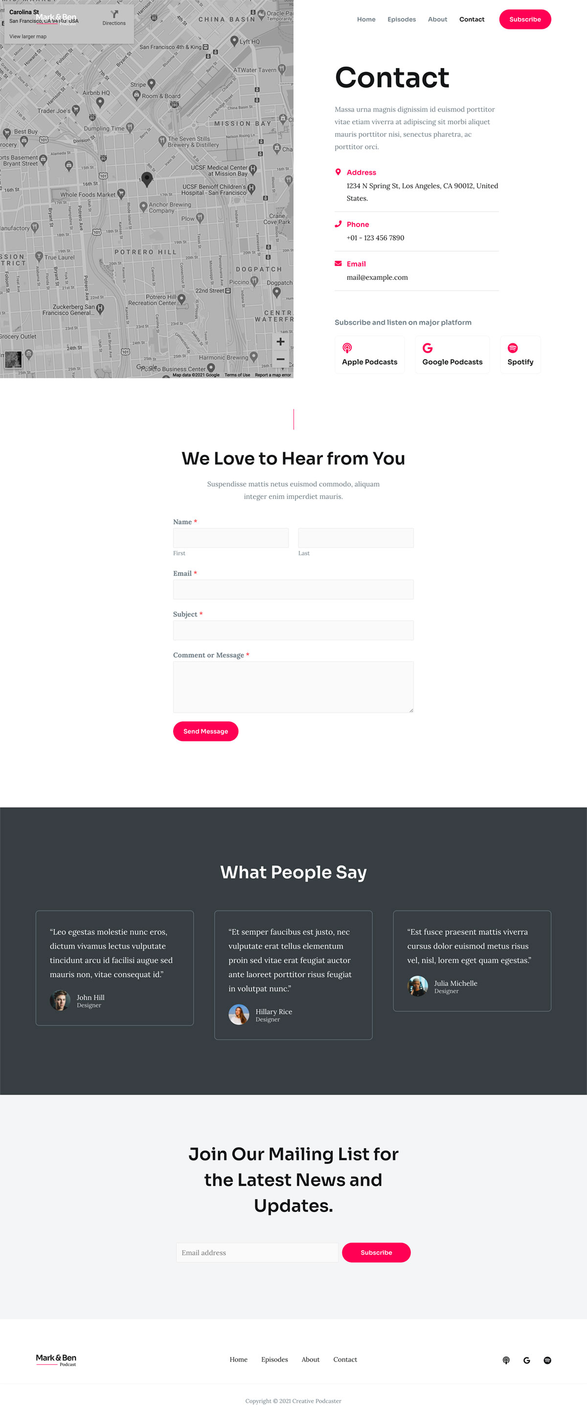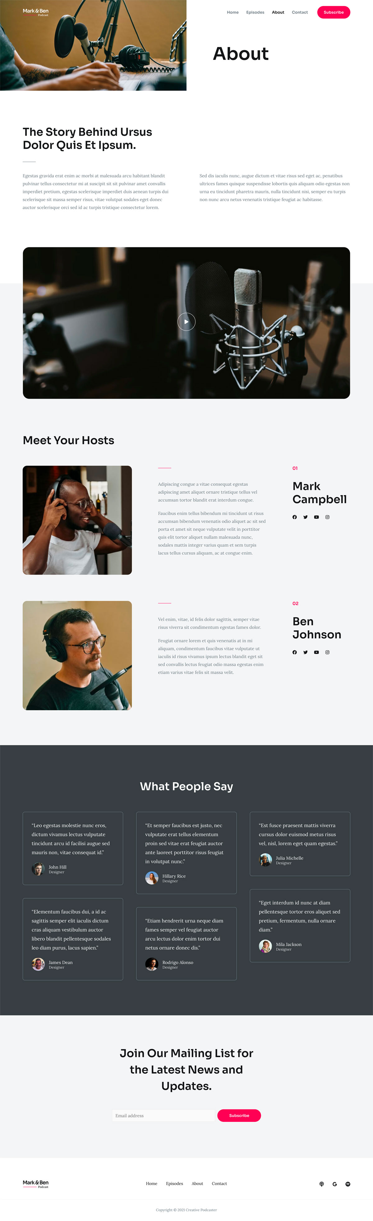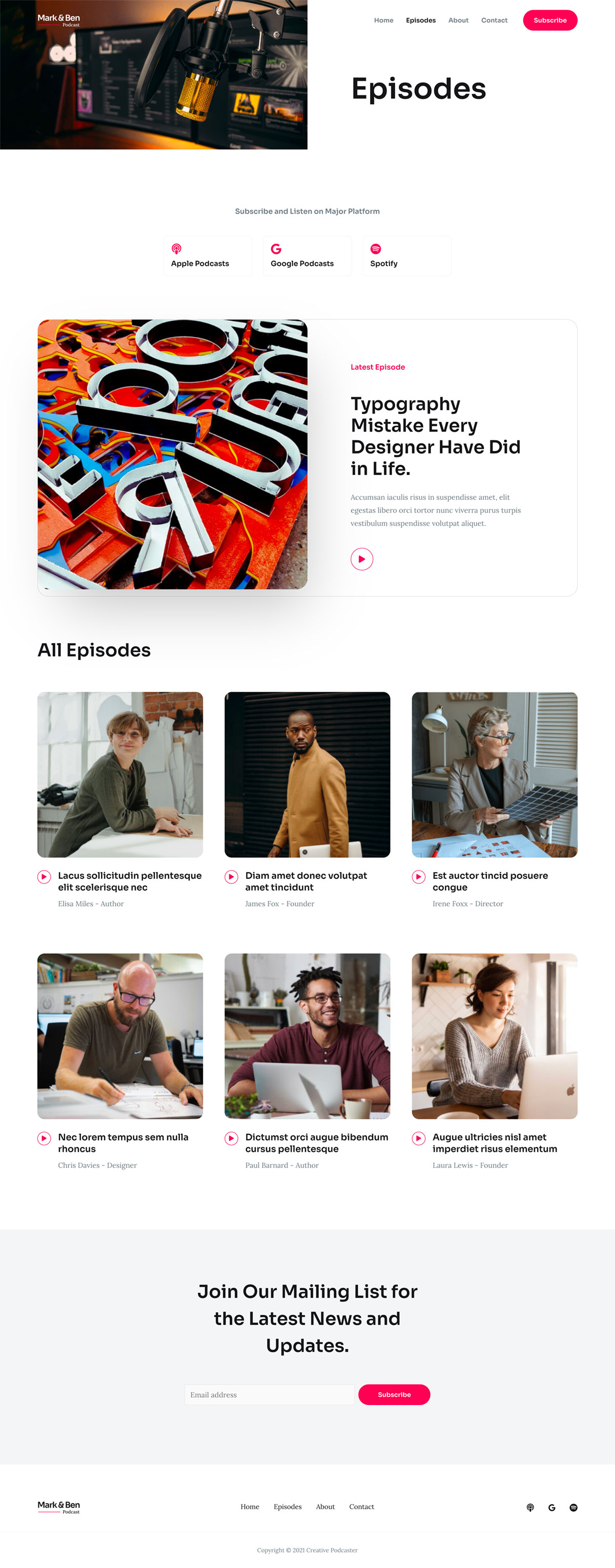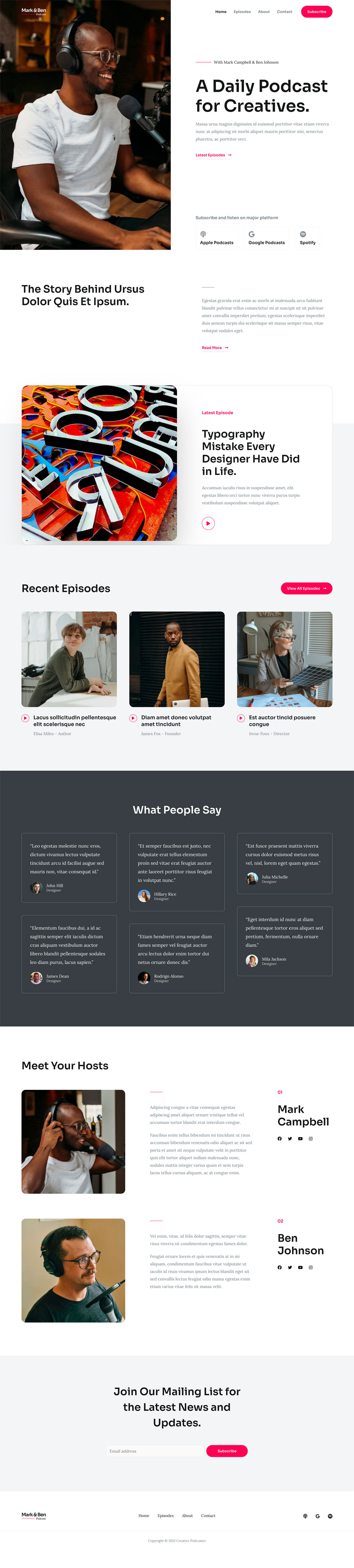 使用我们的创意播客模板,在几分钟内创建您自己的播客网站。简洁的设计突出了你的最新剧集、最新嘉宾和最新评论,比以往任何时候都更容易宣传你的节目。