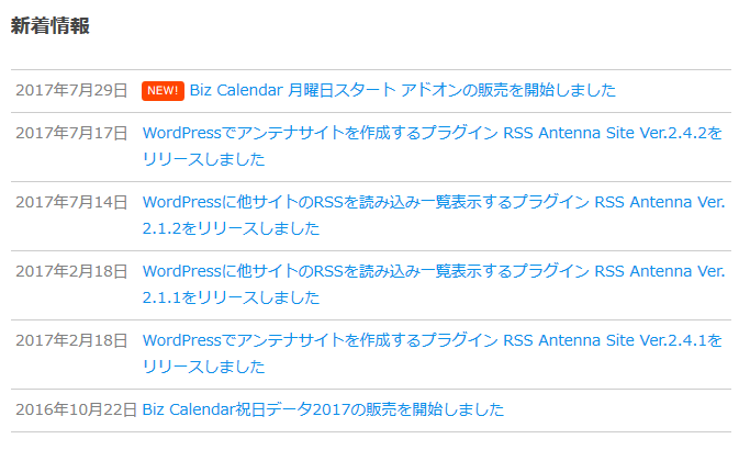 点击下载 最新发电机 插件描述 最新发电机は,投稿,固定ページ,ウィジェットに新着情报を表示するプラグインです。 新着情报の日付,タイトルは自动的に表示されます。また,タイトルをクリックすると该当のページが开きます。 特徴 期间を指定してタイトルにNEW!マークを表示させることができます。新着情报に表示するコンテンツに投稿または固定ページを设定できます。表示する件数を设定できます。表示顺序は,公开日顺·更新日顺から选択できます。カテゴリを指定して记事の新着情报を表示させることができます。(投稿のみ)WordPressの设定画面でこれらの设定を行い,新着表示のプレビューができます。 详细な使用方法はこらです:http://residentbird.main.jp/bizplugin/plugins/whats-new-generator/ 截图 最新消息 管理页面 安装 上传 plugin-name.zip 到 / wp-content / plugins / 目录通过WordPress的“插件”菜单激活插件 FAQ 安装说明上载 plugin-name.zip 到 / wp -content / plugins / 目录通过WordPress的“插件”菜单激活插件 评论