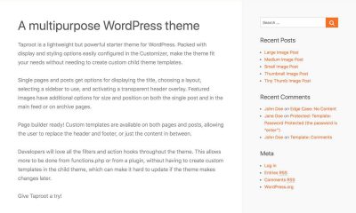 主题预览 点击下载 版本: 0.9.6 主题主页 Taproot是一款轻巧但功能强大的入门主题,可根据各种需求进行定制和扩展。可以在定制程序的许多选项中轻松配置全局网站布局,设置和颜色。单页和帖子可以选择布局,标题,侧边栏,精选图像和标题。可以在“窗口小部件”界面中创建自定义边栏。开发人员可以使用大量操作和过滤器来更改或扩展主题组件,而无需自定义主题模板。无论您是需要干净,简单且随时可用的东西,还是功能丰富的自定义网站的基础,Taproot可能正是您所需要的。