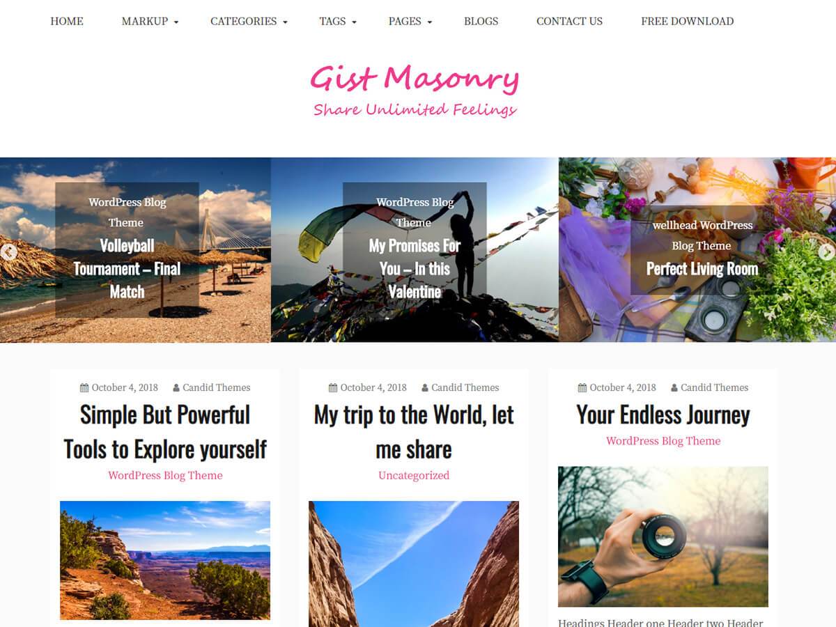 主题预览 点击下载 这是附带子模板主题要点。 版本: 1.0.0 主题主页 Gist Masonry是Gist的儿童主题。它在博客和存档页面上具有砖石布局。这个主题是为博客,新闻和杂志制作的最好的免费WordPress主题。它是一个简单,易于使用,现代和创意,用户友好的WordPress主题与排版,字体和颜色选项。另外Gist Masonry是响应式,跨浏览器兼容的附带子模板主题。 Gist Masonry附带为社交和作者添加自定义小部件,粘贴侧边栏选项,页脚小部件,侧边栏选项,元选项,版权选项,社交选项等。