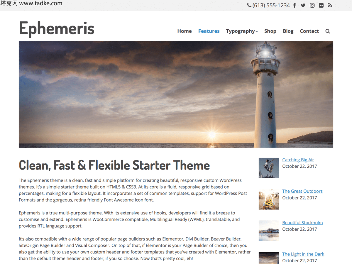 主题预览 点击下载 版本: 1.4.3 主题主页 Ephemeris主题是一个干净,快速和简单的平台,用于创建美观,反应灵敏的自定义WordPress主题。这是一个基于HTML5和HTML的简单入门主题。 CSS3。其核心是基于百分比的流畅的响应式网格,从而实现灵活的布局。它包含一组常用模板,支持WordPress Post Formats和华丽的视网膜友好Font Awesome图标字体。星历是一个真正的多用途主题。随着钩子的广泛使用,开发人员将发现定制和扩展是轻而易举的。 Ephemeris是WooCommerce和bbPress兼容,多语言准备(WPML),可翻译,并提供RTL语言支持。它还兼容各种流行的页面构建器,如Elementor,Divi Builder,Beaver Builder,SiteOrigin Page Builder和Visual Composer。最重要的是,如果Elementor是您选择的页面构建器,那么您还可以使用自己使用Elementor创建的自定义页眉和页脚模板,而不是默认主题页眉和页脚,如果您选择的话。 Ephemeris还支持新的WordPress块编辑器(Gutenberg)。现在这很酷,呃!